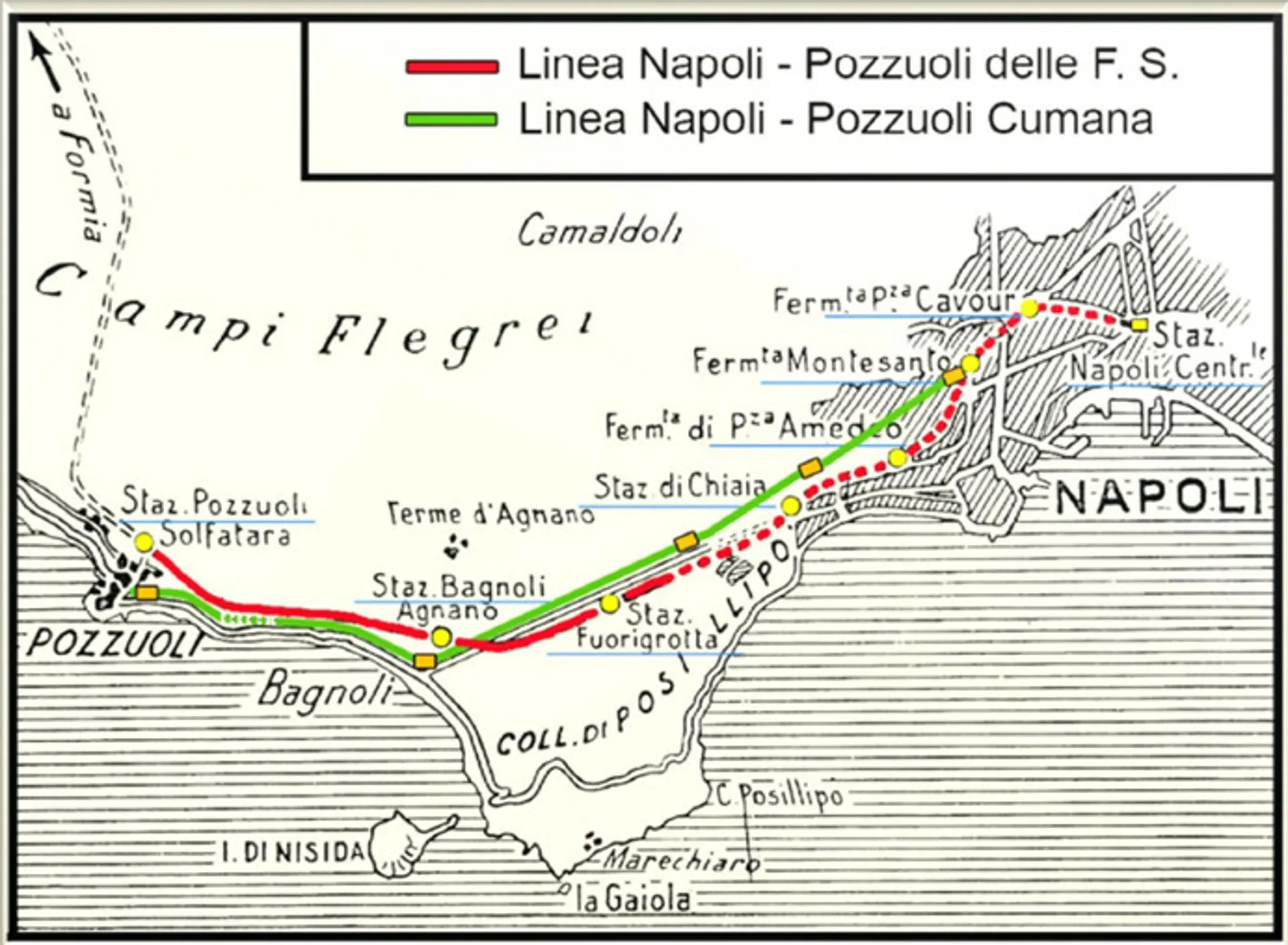 In realtà l’area costiera flegrea era già servita fin dal 1890 dalla ferrovia Cumana che, partendo dal quartiere Montesanto di Napoli, arrivava a Torregaveta dopo 19.8 chilometri (di cui gli ultimi 12 dopo Bagnoli erano lungo il litorale) e che nacque soprattutto per scopi turistici, in quanto Napoli e Pozzuoli erano già collegate tra loro da una tranvia molto frequentata e aperta nel 1883.