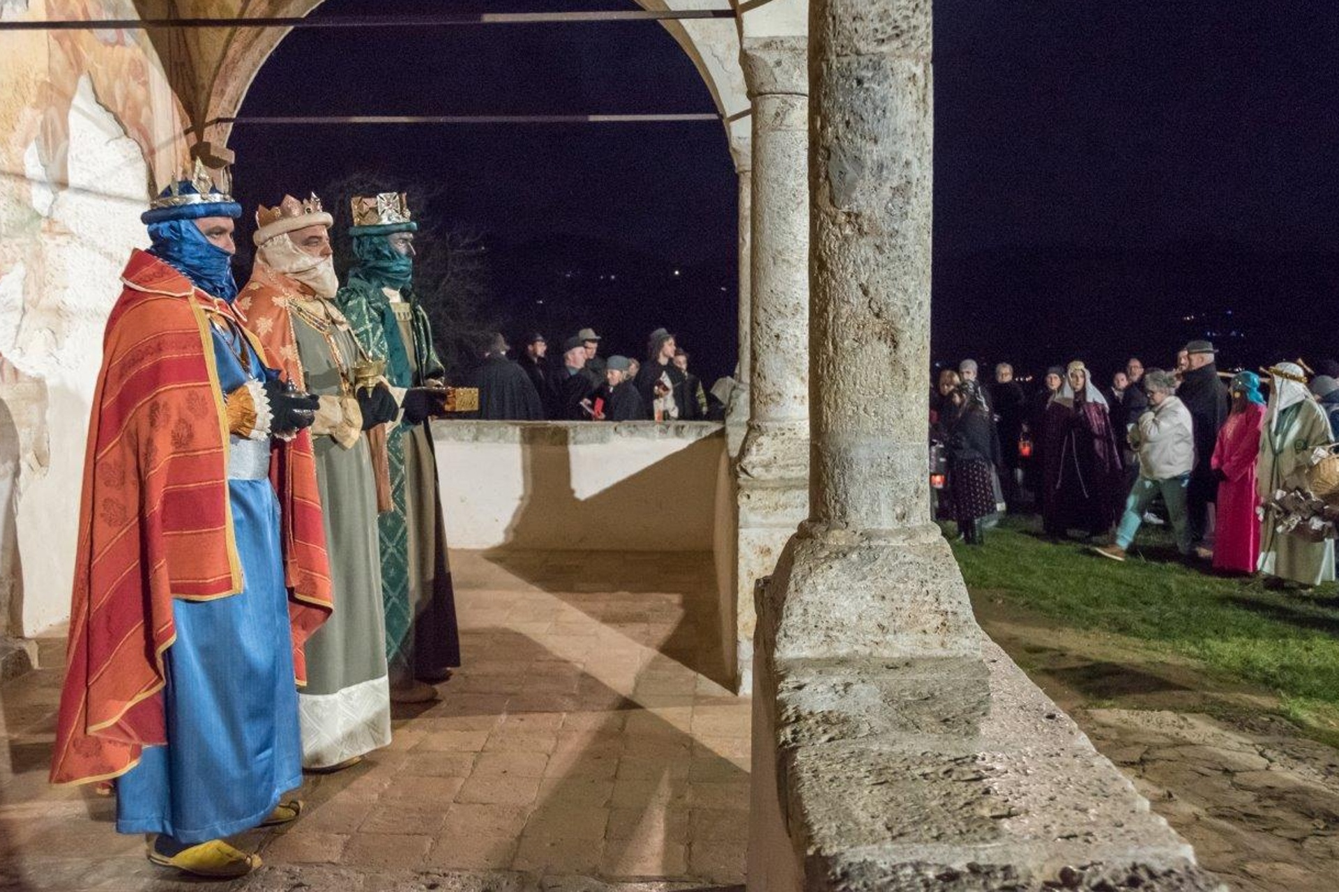 Il corteo riparte poi verso il borgo e raggiunge il cortile affrescato del Suffragio, antico cimitero trecentesco che ha perso da tempo la sua funzione originaria ma conserva intatto il fascino del luogo. Qui avviene l’incontro con la Natività, circondato dalla ricostruzione di antichi mestieri. È qui che si svolge anche la tradizionale distribuzione delle calzine. Elemento centrale della celebrazione sono le letterine dei bambini. «La calzina non si riceve liberamente», spiega il promotore. « La si riceve presentando una letterina ai Magi. Le raccogliamo, le archiviamo e le lasciamo esposte per un anno davanti al sacello dei Magi al Santuario». Un archivio che, nel tempo, diventa una sorta di diario aperto dei desideri della comunità. «C’è chi chiede un regalo, chi la guarigione di un nonno, chi la pace nel mondo. A volte sembrano desideri dei genitori, altre volte sono sogni espressi con un disegno. La magia del sogno resta la componente fondamentale. Le letterine sono tutte conservate e archiviate per permettere a chiunque di ritrovare e rileggere il messaggio che ha affidato ai Magi anche molti anni prima».