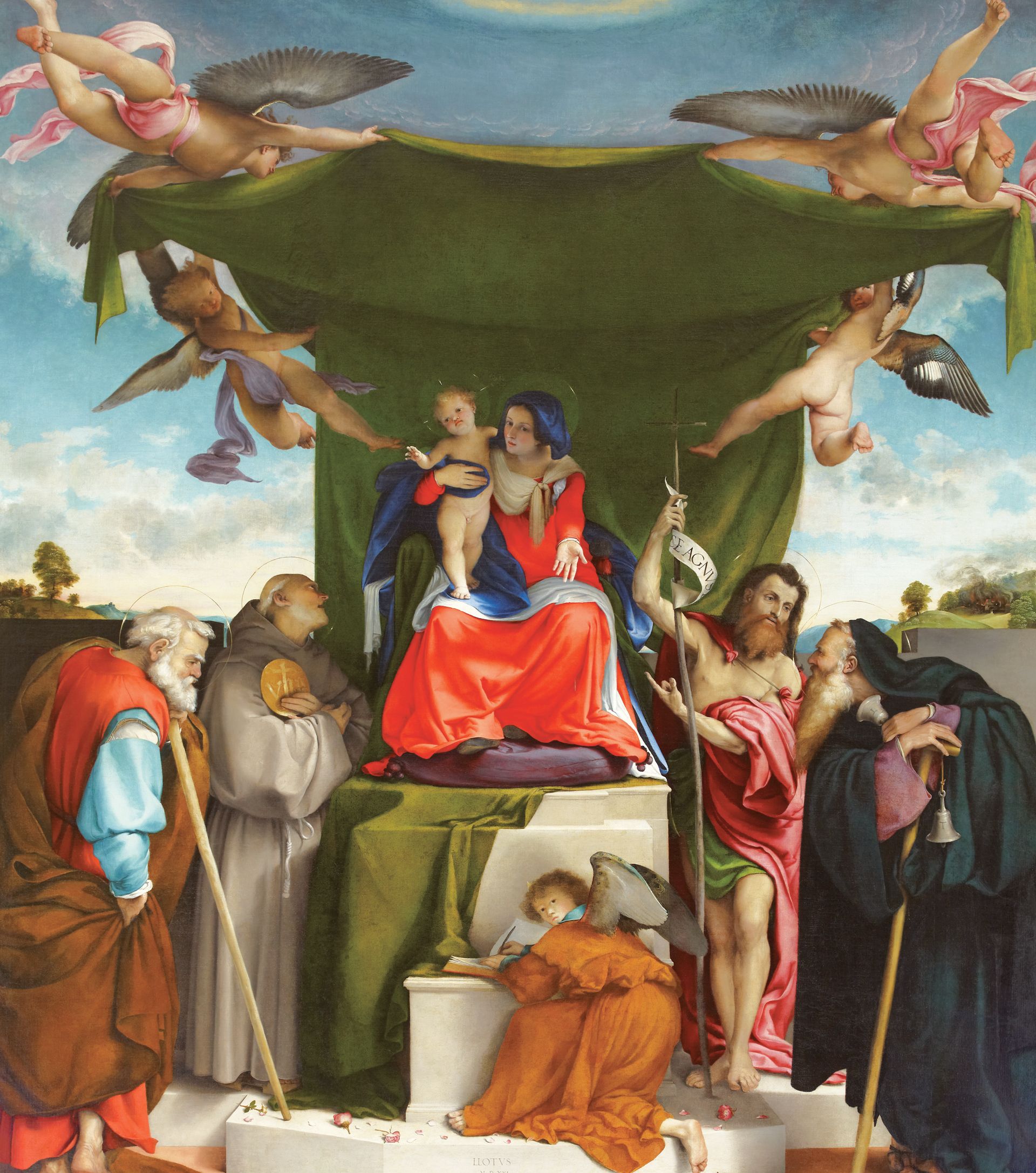 Lorenzo Lotto realizzò la Pala di San Bernardino nel 1521. Gli fu commissionata dalla confraternita laica dei disciplinati, che era composta soprattutto da artigiani e commercianti e aveva sede in via Pignolo, nella chiesa di San Bernardino, appunto. L’artista adottò un’iconografia tradizionale, quella della Madonna con il bambino, ma introdusse soluzioni nuove, come l’utilizzo dello spazio o della luce. Maria è seduta su un trono molto alto, con il bambino, al di sotto di un telo verde che sembra il sipario di un teatro, tenuto da quattro angeli in volo. La scena è ambientata all’aperto, al tramonto. Ai lati del trono, in basso, sono disposti quattro santi in dialogo tra loro e con Gesù: Giuseppe, Bernardino da Siena, a cui è intitolata la chiesa, Giovanni Battista e Antonio Abate. Al centro, c’è un altro angelo. Sta scrivendo, ma si volta di scatto, verso di noi, con uno sguardo interrogativo. Non sappiamo cosa ci sta domandando: forse perché siamo lì, oppure se vogliamo che anche il nostro nome sia iscritto tra quelli di coloro che stanno adorando il Cristo Bambino.