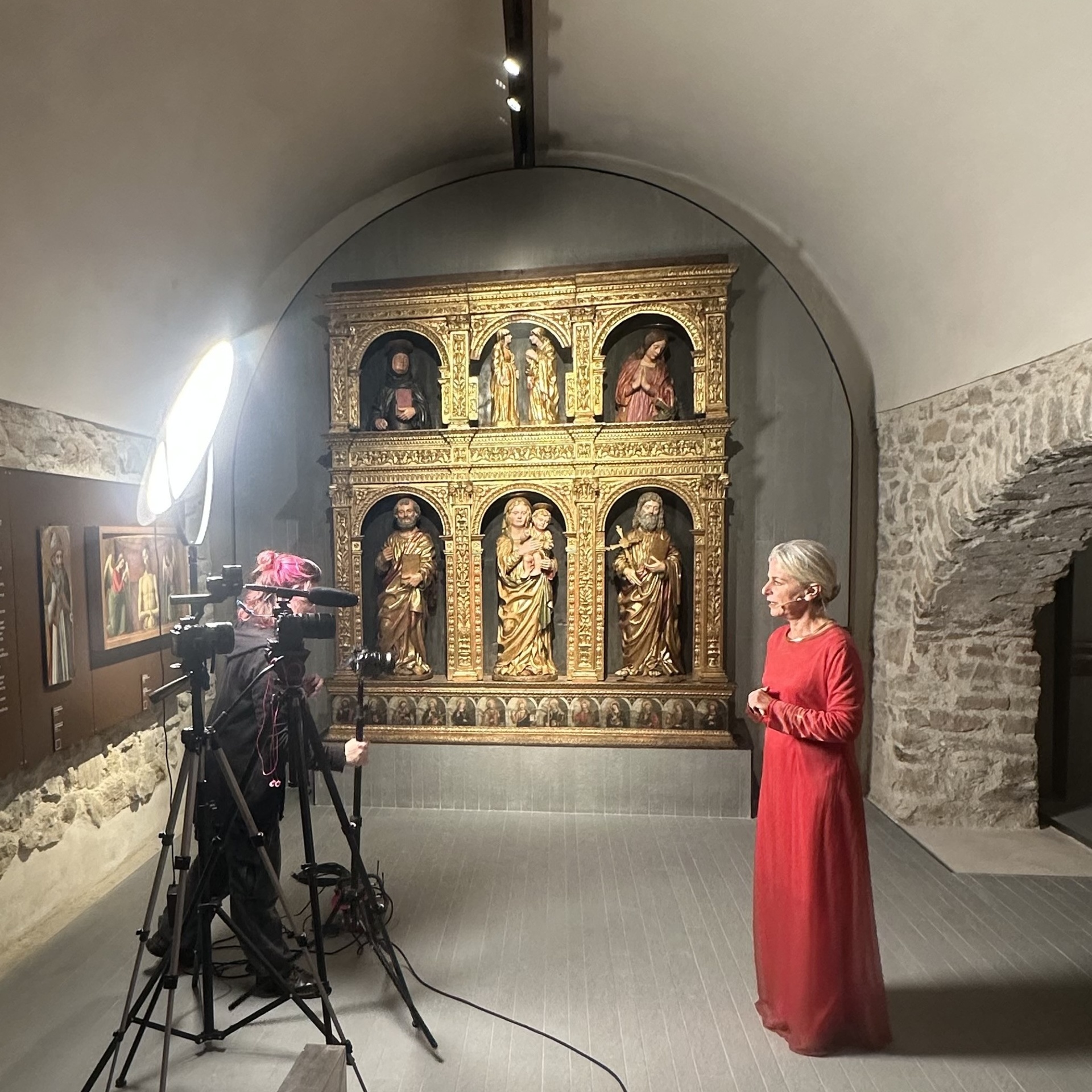 Poi, quella stessa Pala ha preso corpo in modo inaspettato davanti ai nostri occhi. Gli attori del TTB – Teatro Tascabile di Bergamo ne hanno restituito l’atmosfera, mentre le prime visite guidate al museo ci hanno permesso di incontrarla, dopo aver camminato tra sculture del Quattrocento, le nature morte di Baschenis, i dipinti di Moroni e le creazioni di Manzù. La Pala di San Bernardino è l’unica opera esposta in Aula Picta, l’ultimo spazio del percorso, la sala delle udienze del vescovo affrescata nel XIII secolo con scene della vita di Gesù e creature fantastiche dei bestiari medievali.