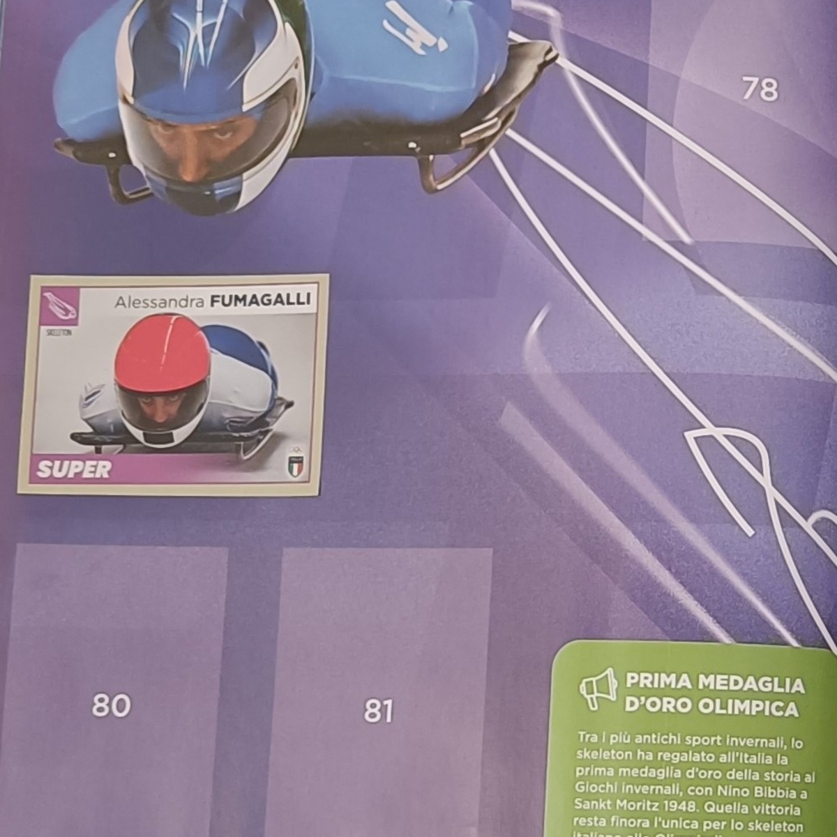 Una sera mi giunge un messaggio di Alessandra: «Sai che mi hanno inserito nell’album delle figurine Panini dei Giochi Olimpici?». In un attimo sono tornato bambino, a quel 1972, ai Giochi Olimpici di Sapporo, quando avevo completato l’album. La figurina di Gustavo Thoeni, che avevo tripla, non l’ho mai scambiata con nessuno perché per me Thoeni era un idolo. All’indomani mi sono precipitato dal giornalaio di Redona ed ho preso l’album e tutti i pacchetti di figurine che gli erano rimasti (ehm…32!). Che gioia riempirsi le mani di quei pacchetti, aprirli e iniziare a passare le figurine una ad una…finché: «eccola, l’Ale!». È la prima figurina che ho attaccato sull’album e poi con un rito che credevo sopito nel tempo mi sono divertito ad appiccicarle, una ad una, come allora!
