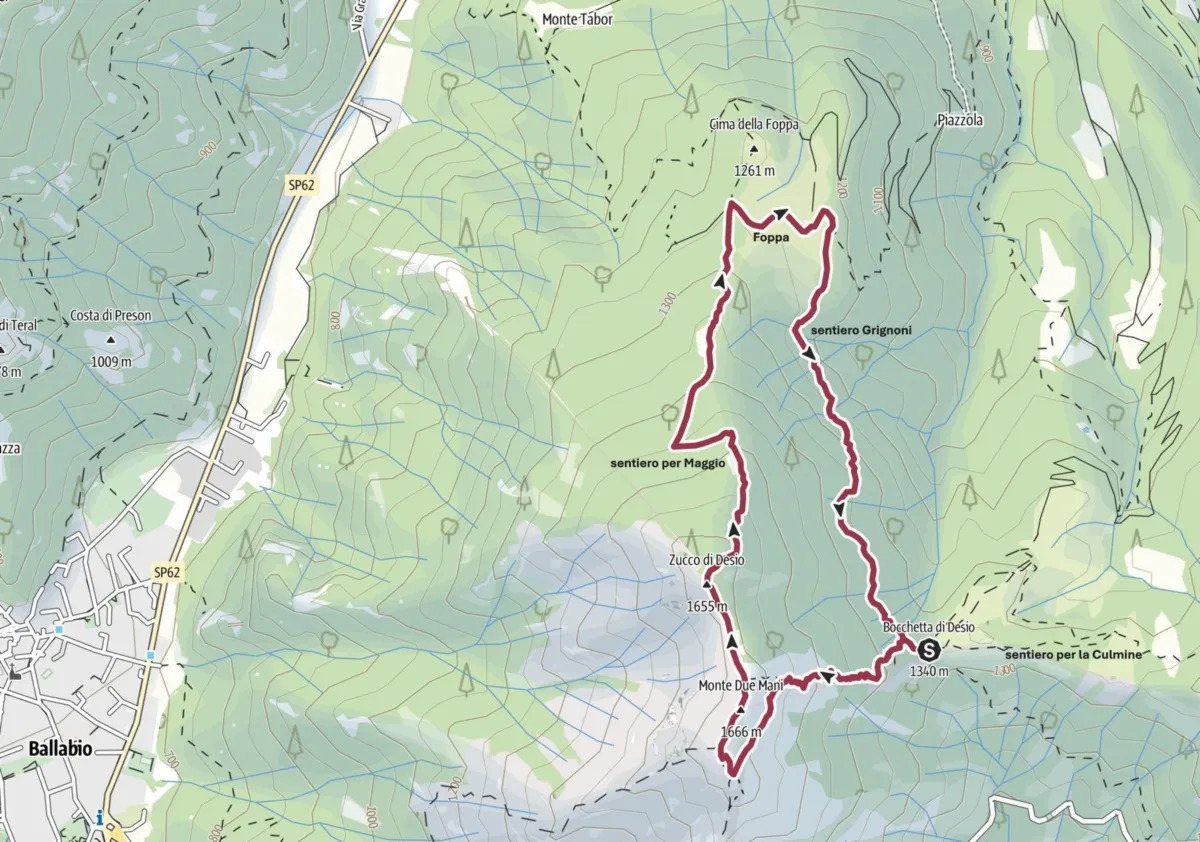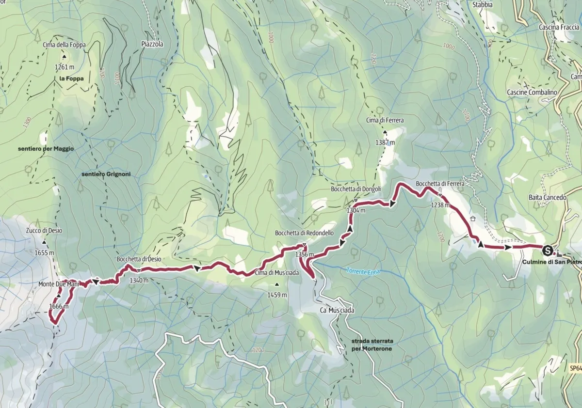 A chi invece non ha fretta suggerisco di completare l’escursione compiendo un piccolo anello: dalla croce di vetta si segue il panoramico sentiero del crinale Nord (in direzione di Maggio) fino alla località la Foppa (1260m), bel pascolo con alcune cascine ben ristrutturate. Da qui, salendo sulla collinetta sopra il caseggiato, si prende il «Sentiero dei Grignoni» (paletti bianco/rossi) che, in leggera salita, riconduce alla bocchetta di Desio. Da qui si torna alla Culmine per lo stesso sentiero dell’andata.