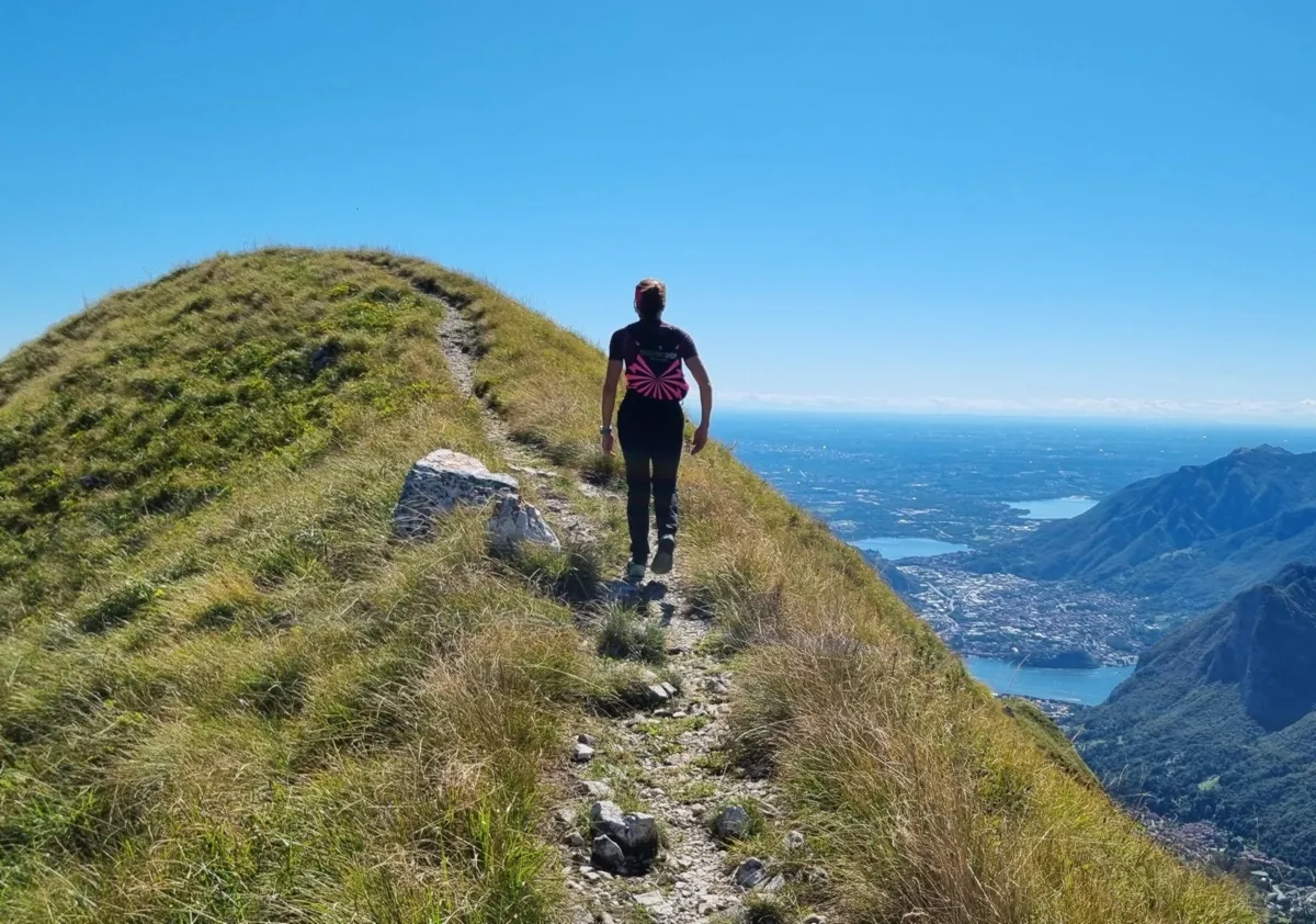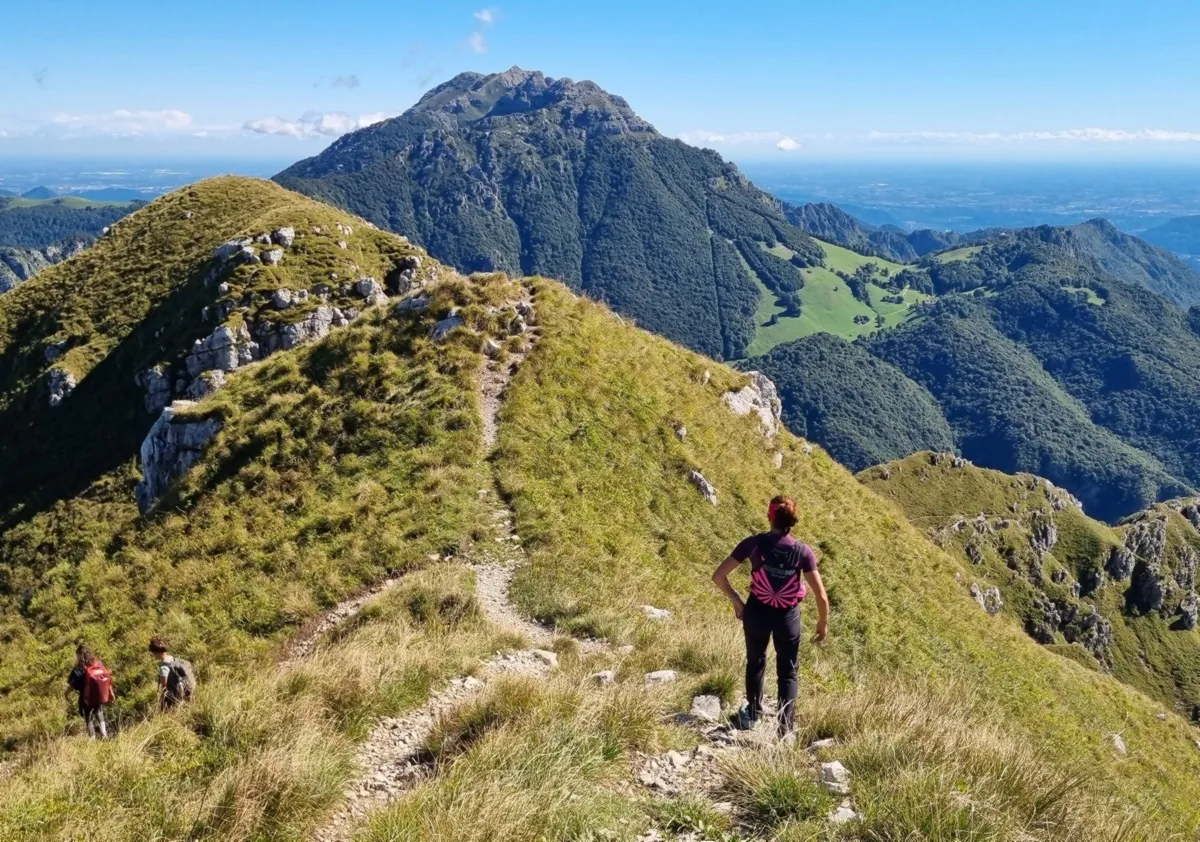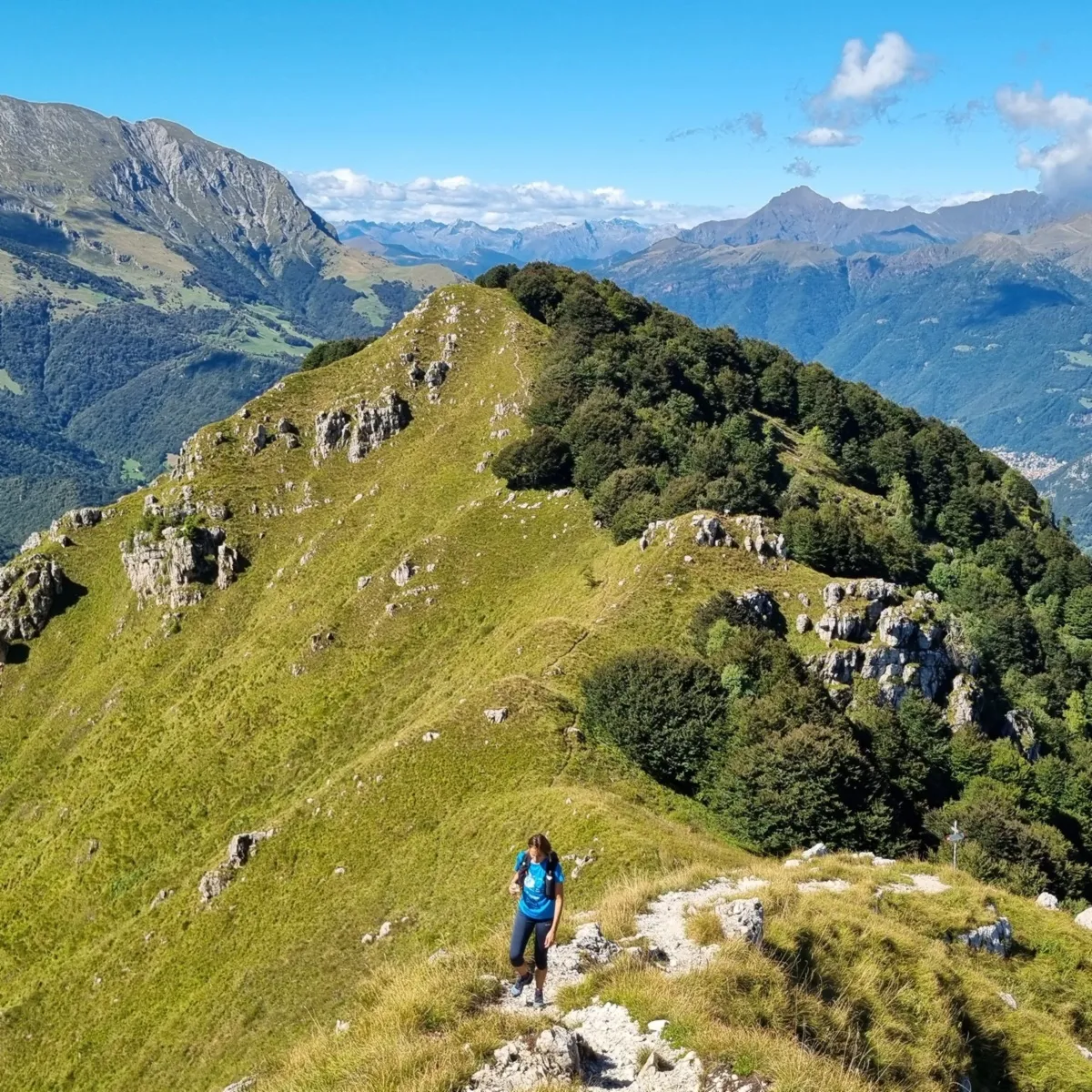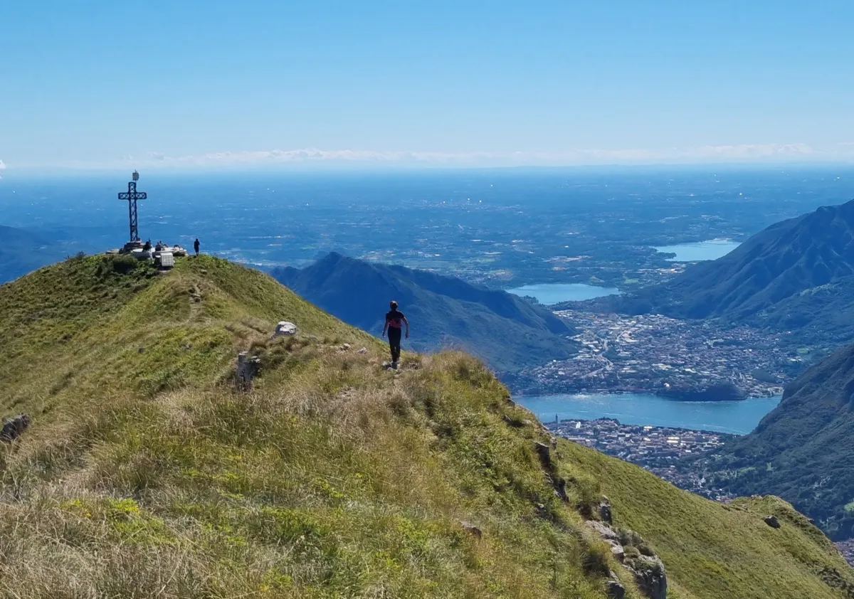 Giungiamo così sul crinale senza fiato non tanto per lo sforzo profuso quanto per la meraviglia che si presenta ai nostri occhi: Grignetta, Grignone, Ballabio e il pian dei Resinelli sono lì dinnanzi a noi, talmente vicini che sembra quasi di toccarli. L’entusiasmo ci fa percorrere gli ultimi metri di salita senza più percepire la fatica. Procedendo sul crinale la vista si apre ulteriormente verso Sud regalandoci scorci eccezionali sui laghi di Lecco, Garlate, Annone e Pusiano e sul Resegone che da qui ha tutt’un altro aspetto.