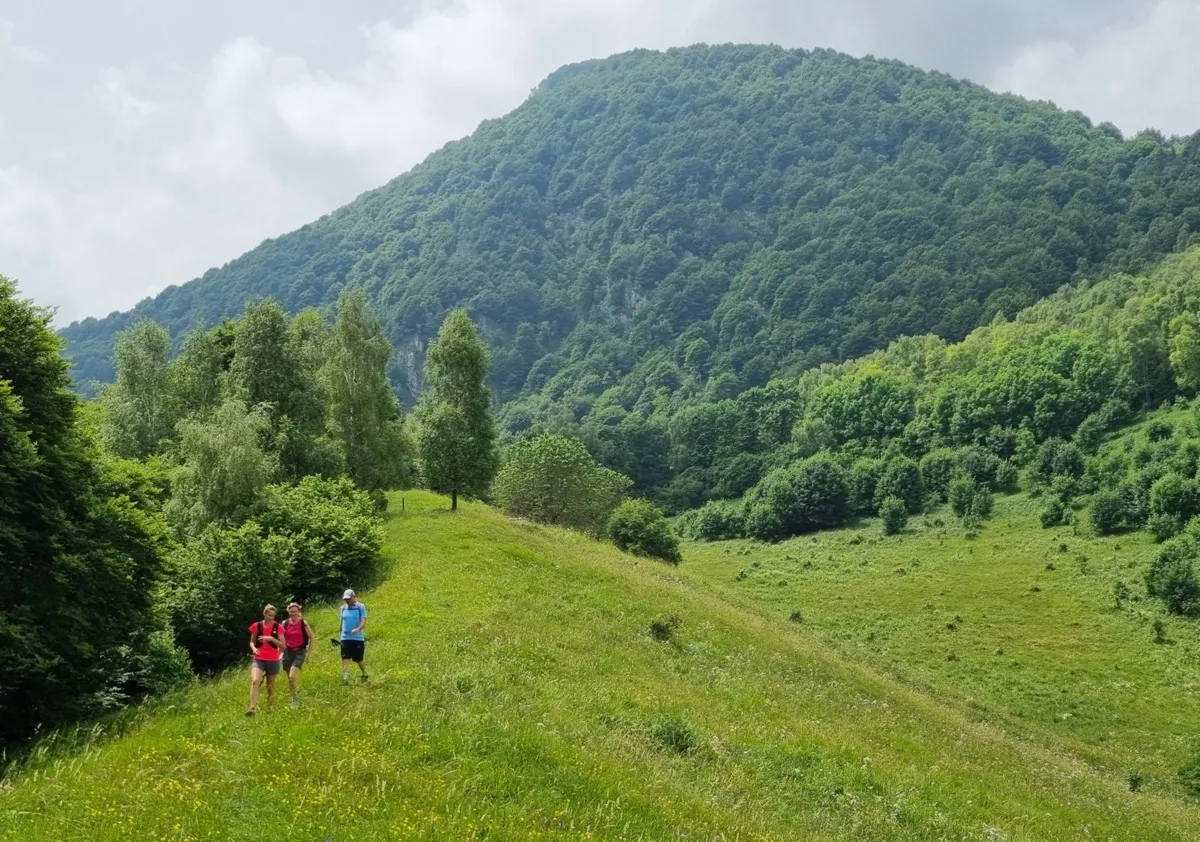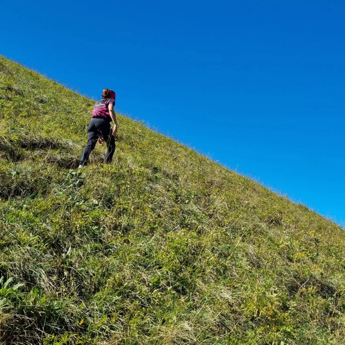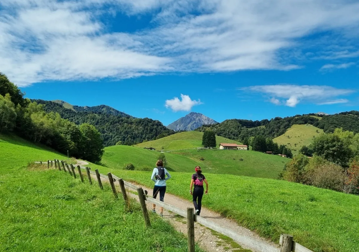 Così, mentre su Bergamo incombevano ancora le piogge, alle 14 ci presentiamo alla Culmine di San Pietro (1258m) con i raggi di sole che già sorridono alle due valli. Imbocchiamo la sterrata che dal ristorante bar del Passo si spinge in leggera discesa verso Ovest, in direzione di Morterone. Il primo tratto è un dolcissimo percorso ondulato attraverso pascoli rigogliosi e assolati. Si lambiscono alcuni invitanti agriturismo ma a settembre notiamo che sono già chiusi. Mantenendoci sulla strada sterrata tocchiamo dapprima la bocchetta di Ferrera (1238m) e poi sfioriamo la bocchetta di Dongoli (1304m). Poco oltre, ad una biforcazione, abbandoniamo la strada per Morterone e saliamo sulla destra. Nei pressi di una cascina diroccata, sulla destra, si diparte il sentiero diretto alla bocchetta di Desio e al Monte Due mani. I cartelli indicatori non lasciano dubbi.