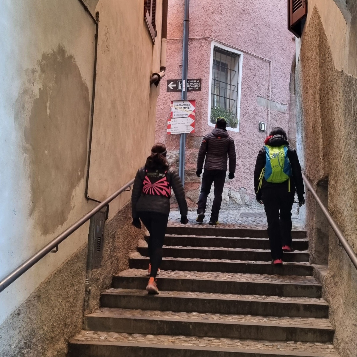 Seguiamo ora la strada asfaltata che percorre tutto il lato Nord, senza sole ma con il magnifico scenario dell’isoletta di Loreto sovrastata dalle imponenti guglie della Corna dei Trentapassi. In poche decine di minuti giungiamo a Siviano dove siamo riabbracciati dal calore dei raggi. Questo paese è vivace, incrociamo molte persone e presso la piazzetta giocano i bimbi mentre il bar centrale brulica di isolani. Procediamo con passo celere lungo la strada principale in un’atmosfera soave e silenziosa, interrotta di tanto in tanto dal rombo sopito di qualche motoretta.