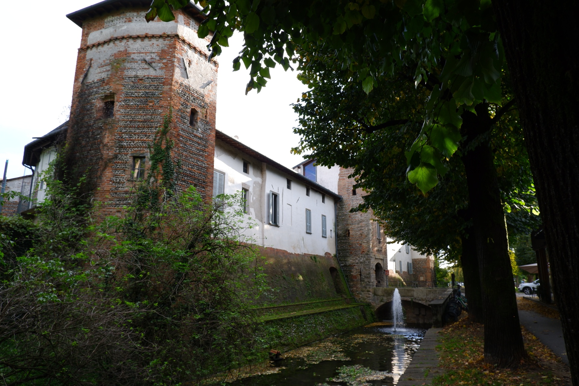 Mentre le nuvole si addensano, raggiungo Cologno al Serio, la mia meta di oggi, che ho deciso di visitare perché già in una precedente occasione la passeggiata che si sviluppa lungo l’antico fossato mi aveva affascinata. Il centro storico di Cologno è infatti circondato da un fossato, anche se pare che in passato fossero due i canali concentrici, molto più profondi di quello attuale, a proteggere l’antica cinta muraria. Oggi non ci sono più nemici a cui rendere estremamente difficile l’ingresso al paese, ma solo persone che passeggiano con tranquillità o approfittano del pomeriggio festivo per fare una corsetta. Il borgo ha quattro porte fortificate, una per ogni punto cardinale: porta Antignano a Est, porta Cassatica a Sud, porta Moringhello a Ovest e porta Rocca a Nord. La mia passeggiata a Cologno inizia proprio da qui, davanti alla porta che guarda in direzione di Bergamo, dove ancora si vedono i segni dell’antico ponte levatoio.
