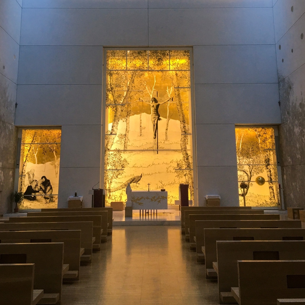 L’interno ha gli stessi colori, resi ancora più luminosi dal bianco dei marmi e dalla luce naturale che viene convogliata verso l’altare. Anche in questo caso, è vietato restare fuori, perché l’elemento sorprendente di questa chiesa è il soffitto: una cupola, sì, ma rovesciata. Colpiscono anche le linee pulite e ordinate del battistero e le tredici colonne che compongono l’altare. Tutti questi elementi danno a chi visita la chiesa una sensazione che si avvicina molto alla serenità di essere accolti da qualcuno a cui potersi affidare.