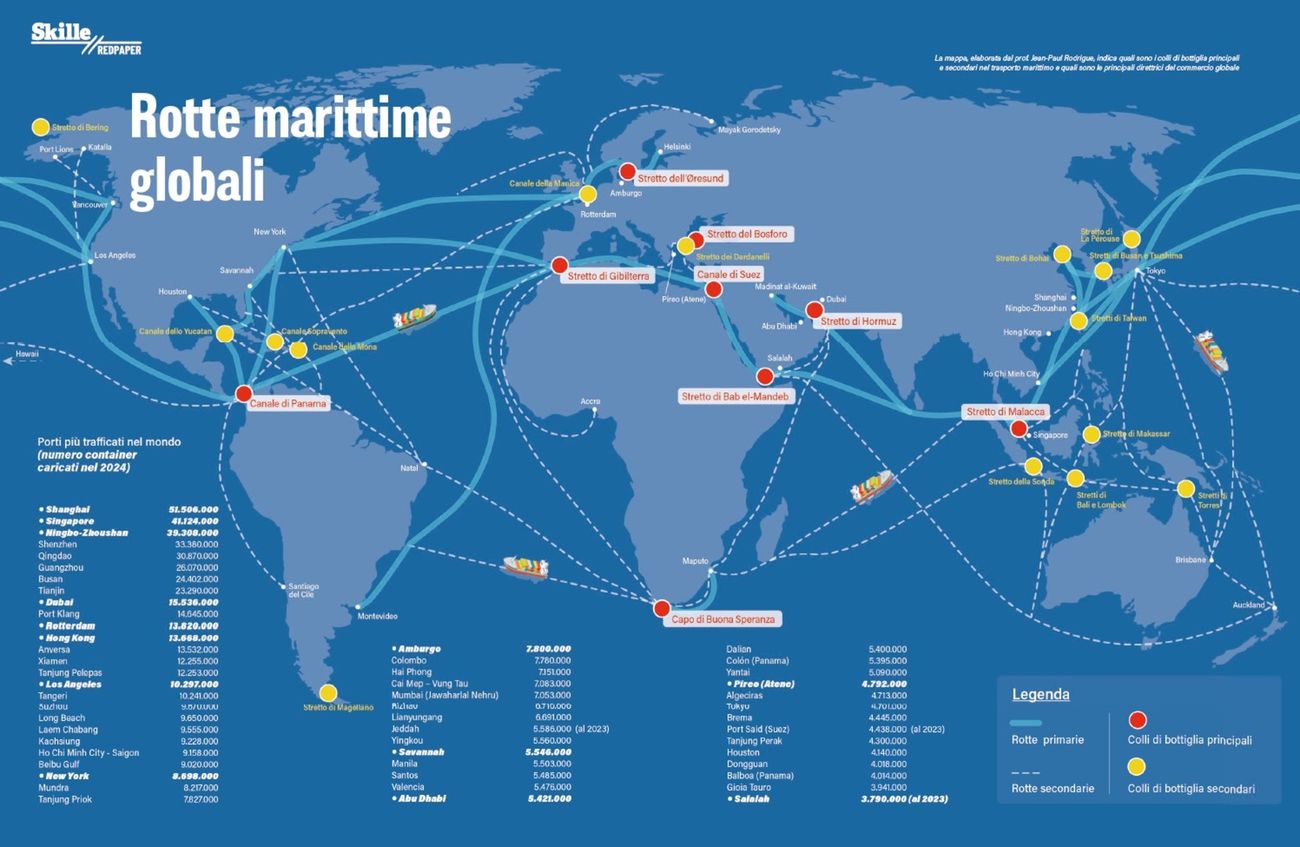 Il commercio internazionale si basa su poche rotte marittime consolidate.Tra due porti c’è un numero potenzialmente infinito di rotte, ma la configurazione dei trasporti moderni, per garantire l’efficienza delle traversate ed evitare ostacoli di natura fisica e geopolitica, è quella della mappa presente in queste due pagine: le tratte più battute sono poche e coprono distanze lunghissime. Le rotte marittime transitano nella maggior parte dei casi da alcuni punti di passaggio pressoché obbligati, che nel tempo sono diventati dei colli di bottiglia strategici per il controllo dei commerci globali. Tante potenze, nel tempo, hanno combattuto per la supremazia su quelle che alcuni studiosi chiamano le “giugulari dell’economia globale” - perché basta reciderne una per distruggere i flussi commerciali dell’intero pianeta. La mappa, elaborata dal prof. Jean-Paul Rodrigue, studioso dei trasporti marittimi del Dipartimento di Amministrazione aziendale marittima della Texas A&M University di Galveston, indica quali sono i colli di bottiglia principali e secondari nel trasporto marittimo e quali sono le principali direttrici del commercio globale.