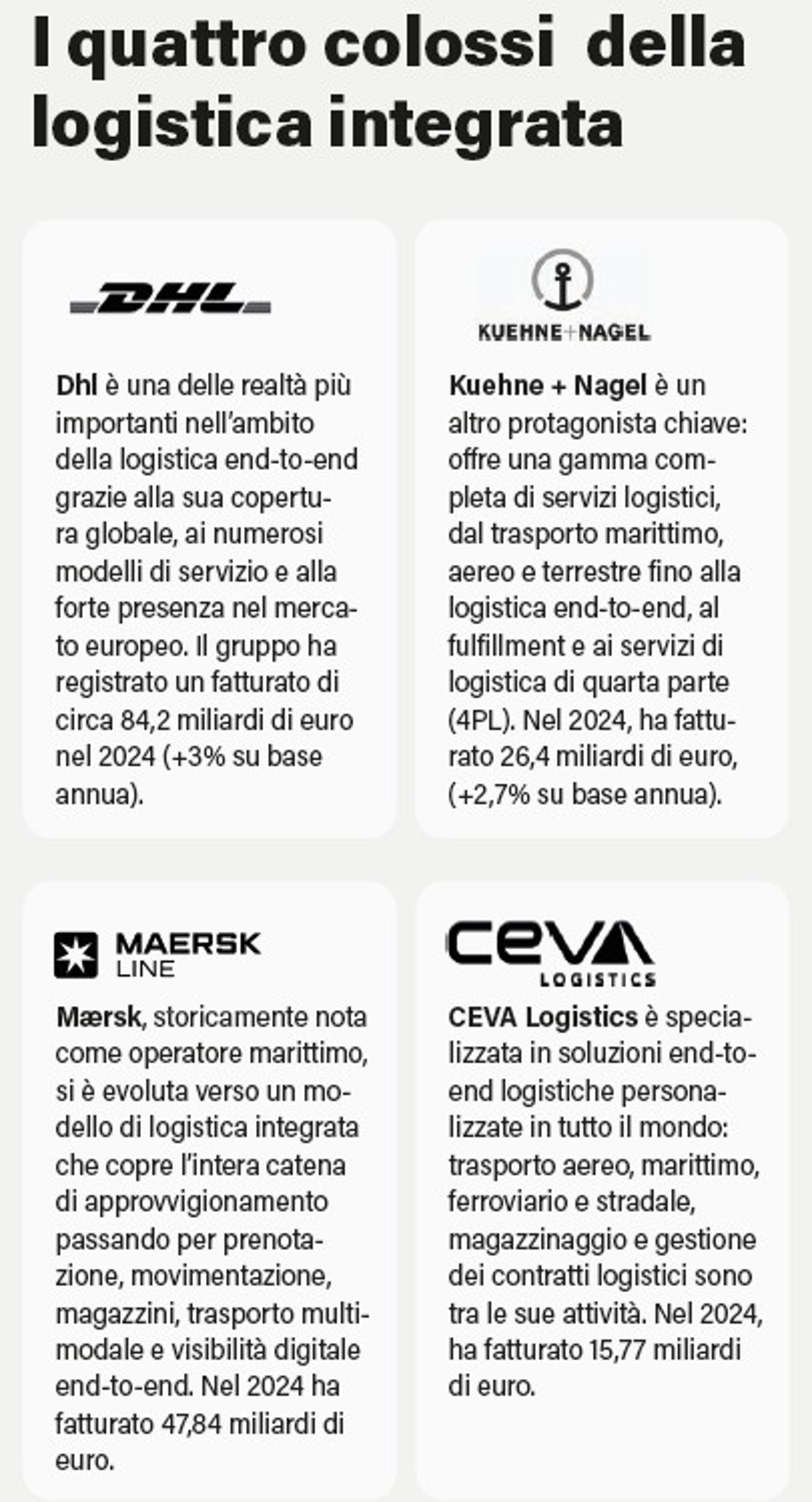 Non è un caso che la logistica integrata porti con sé un cambio di paradigma: si passa infatti da una pletora di operatori separati, ciascuno specializzato in una sola parte della catena (la gestione di magazzino, le consegne, lo sdoganamento) a un servizio end-to-end, che prende in carico il pacco (o il container) e lo recapita al destinatario in maniera totalmente autonoma.