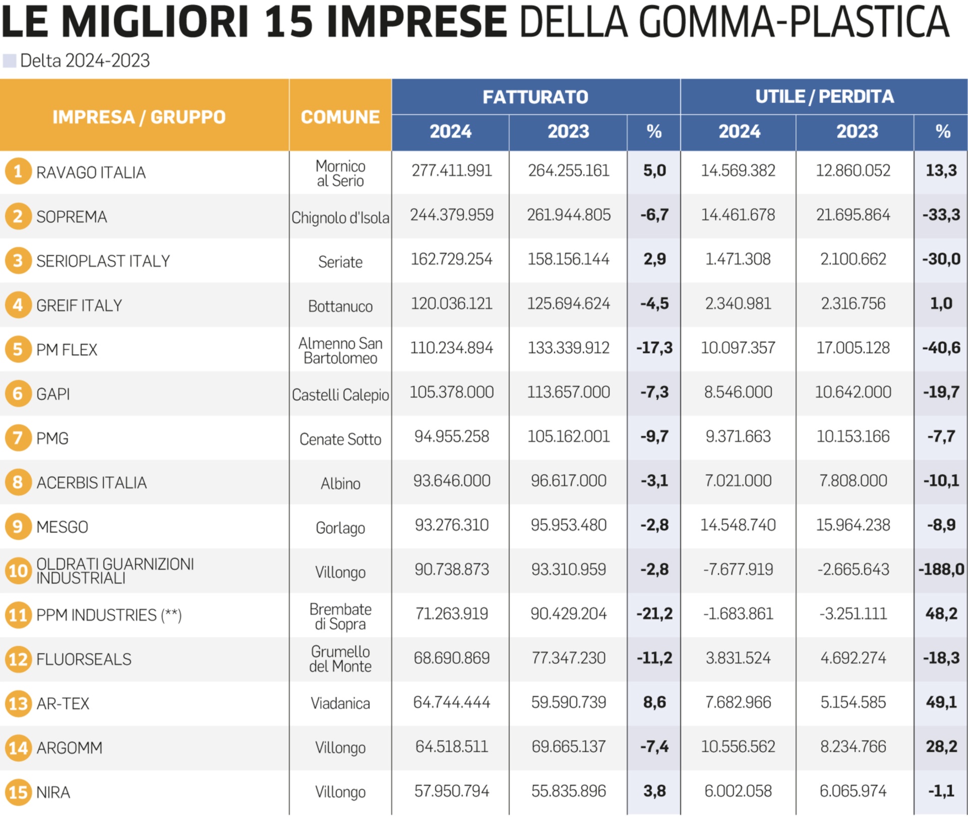 Il distretto lombardo della gomma-plastica si conferma come un punto di riferimento della manifattura italiana. La produzione del settore trova applicazione in ambiti strategici quali automotive, medicale, alimentare e oil & gas, confermandone il ruolo centrale a livello locale e nazionale. L’Italia, a livello internazionale, si colloca al quarto posto tra i maggiori esportatori, dietro Germania, Stati Uniti e Polonia, con un fatturato complessivo che supera i 4 miliardi di euro e un’incidenza dell’export superiore al 70%. Analizzando le principali imprese bergamasche si rileva, rispetto all’anno precedente una contrazione del fatturato pari al 4,3% e una riduzione del risultato di esercizio superiore all’11%, accompagnata da un lieve incremento del numero di aziende che chiudono l’anno in perdita. Il tasso di remunerazione del capitale proprio (Roe) mostra un calo contenuto, passando dall’12,8% al 10,7%, mentre la redditività complessiva del capitale investito (Roi) è stabile vicino al 9%.