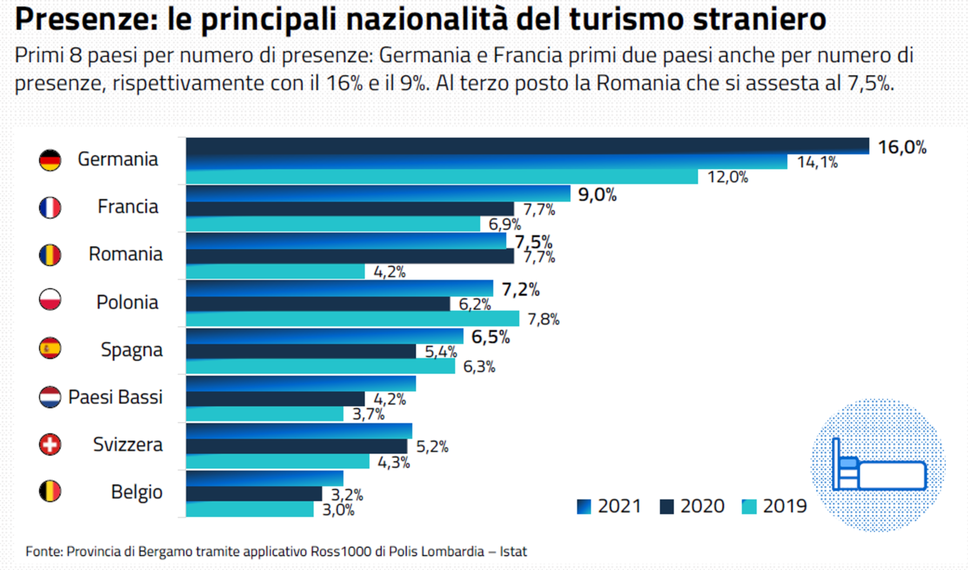 La beffa è che, nonostante due anni duri, secondo l’Osservatorio turismo della Provincia di Bergamo, le ultime rilevazioni sui flussi di ingresso sono confortanti anche grazie all’alleggerimento delle restrizioni. Guardando indietro alla Pasqua, nei tre giorni a cavallo della festività, «si è registrato un tasso di occupazione nettamente superiore rispetto al 2021 (+68,2% di camere occupate) ma anche rispetto al 2019 (+18,6%)». In particolare, spiegano dall’ente Provincia, «si continua a guardare al futuro con ottimismo. I dati delle prenotazioni per il periodo estivo fanno ben sperare: ad oggi il 18,9% delle camere disponibili risulta già prenotato per il periodo estivo dal mese di aprile. Era il 4,9% nel 2021 e il 18,6% nel 2019. Le prenotazioni last minute, esplose nel 2021, tornano ad assestarsi sui lavori prepandemici (36% nel 2019 e 36,9% nel 2022)».