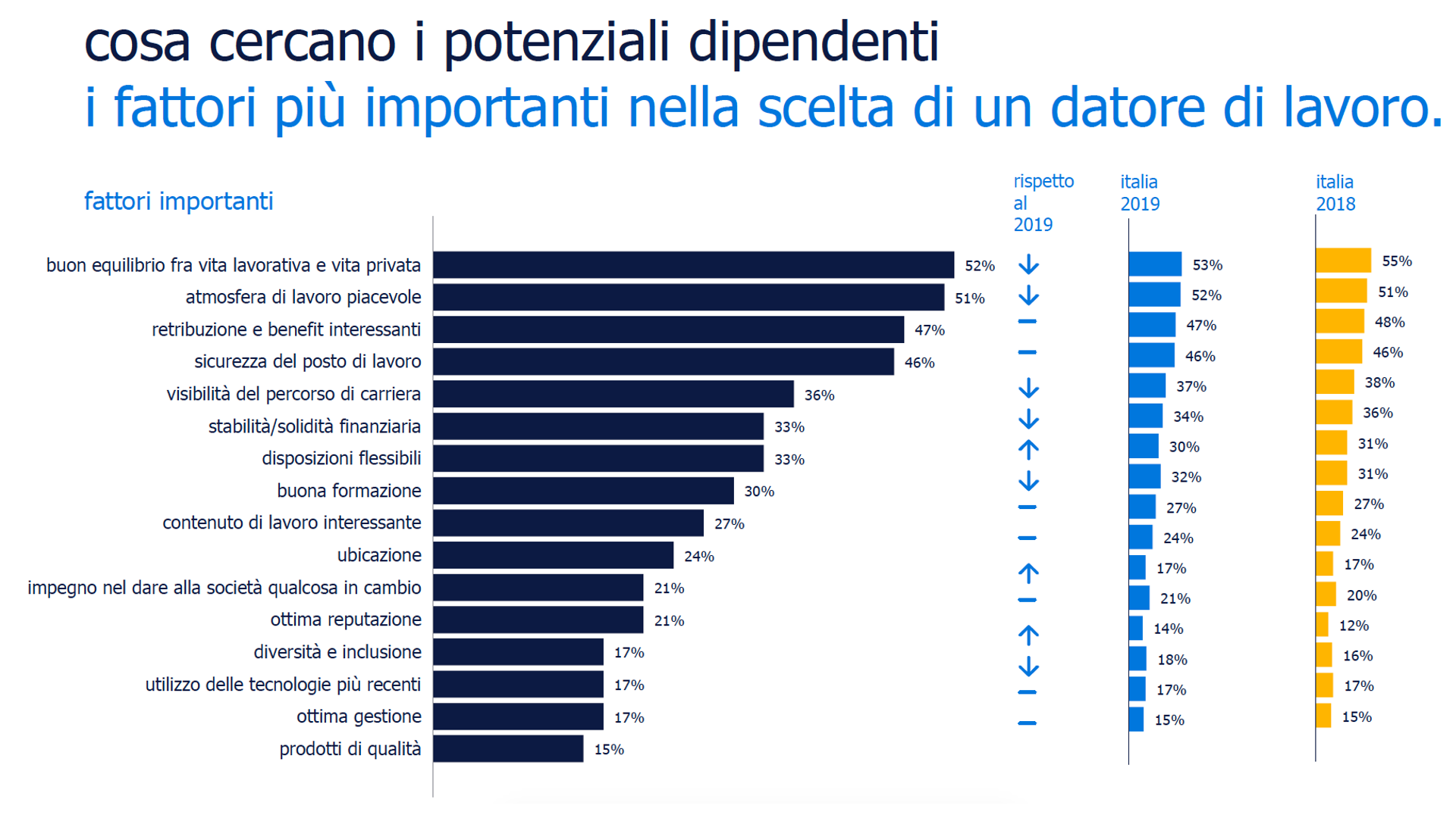 Gli italiani cercano nel datore di lavoro ideale prima di tutto conciliazione tra vita privata e professionale, atmosfera di lavoro piacevole, insieme a un buon stipendio. Ci sono però profonde differenze per età. I più giovani, appartenenti alla fascia d’età (18-24 anni), ricercano aziende con un’atmosfera di lavoro piacevole che offrono possibilità di carriera e ottima formazione; il segmento 25-34 anni guarda prioritariamente alla retribuzione ed ai benefits; gli adulti della fascia 35-54 anni cercano prima di tutto work-life balance, che risulta al primo posto anche per i 55-64 enni. Simile interesse anche per sicurezza del posto e solidità finanziaria dell’azienda.Mi preme anche sottolineare un aspetto di estremo interesse per le aziende a cui restituiamo questi risultati. C’è la voglia di chiedersi come si possono portare dentro le organizzazioni certi valori, ad esempio, la diversity & inclusion non solo come valore culturale dell’azienda da diffondere con una formazione specifica ma anche come portarla sui processi, ad esempio nella Talent Acquisition. Per essere semplice, si fanno la domanda: “ma come faccio a fare job posting inclusivi?”. Ecco che questo ci porta ad un lavoro sui processi molto interessante, pratico, concreto.