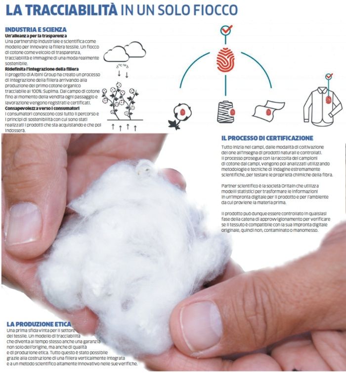 «È il primo passo di un percorso industriale sostenibile: registra e certifica tutti i passaggi lavorativi di ogni materia prima (per noi il cotone) e rendere quelle informazioni trasparenti e disponibili ai consumatori. Significa controllo severo sull’intera filiera».