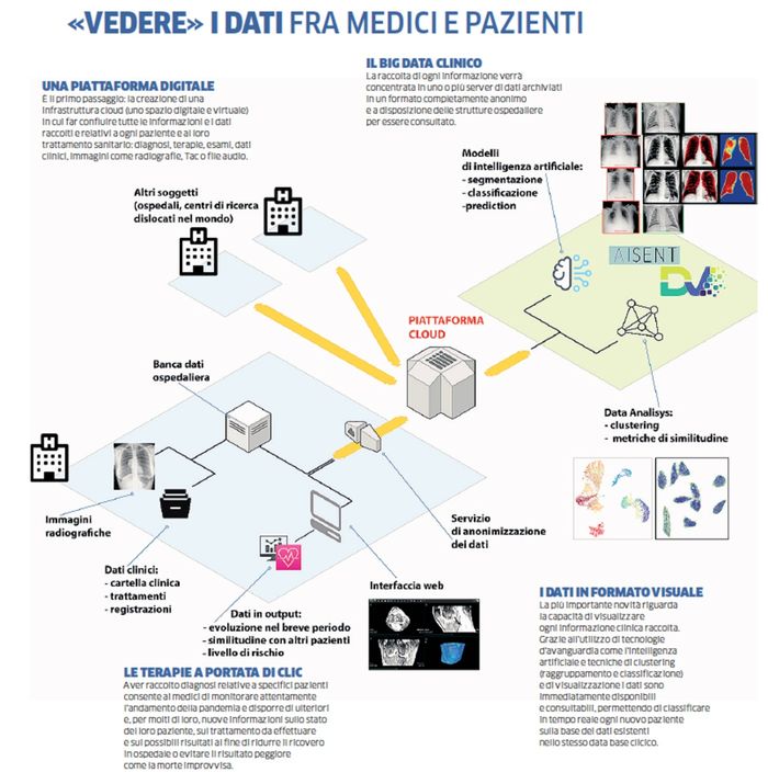 E qui interviene il valore medico-sanitario del progetto: il passaggio finale porta alla creazione di una piattaforma cloud per condividere i dati clinici tra i diversi ospedali e al loro interno fra tutti i medici. L’utente finale della piattaforma è, infatti, il medico coinvolto nel trattamento dei pazienti covid-19. Ma al tempo stesso si trasforma anche in primo attore dell’arricchimento del data base: grazie alla piattaforma il medico potrà caricare una serie di dati strutturati (dati clinici, immagini digitali, file audio), che verranno archiviati in un formato completamente anonimo nel database principale.