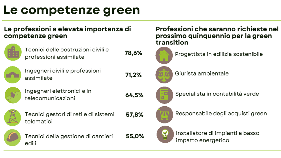 L’attitudine al risparmio energetico e alla sostenibilità ambientale si conferma quindi un requisito base per entrare nel mercato del lavoro: se nel 2021 le imprese hanno denunziato un fabbisogno di competenze verdi per 3,5 milioni di posizioni, ancora oggi almeno nel 37,9% dei casi quelle stesse posizioni hanno alzato il livello di preparazione nel settore della transizione ecologica a «un grado di importanza per la professione elevato».