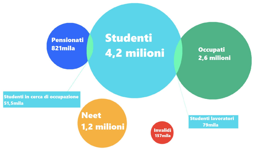 I numeri, partendo dalla disoccupazione: se l’Italia fosse allineata alle medie europee, è la sintesi del report Randstad, riguardo al tasso di attività e al tasso di disoccupazione della classe di età 15-64 anni, avrebbe oggi, secondo un semplice esercizio di confronto, almeno 4 milioni di occupati in più. I numeri fanno emergere anche altre criticità: complessivamente, ci sono quasi 26 milioni di persone inattive fra i 15 e i 69 anni, di cui i famosi 5,3 milioni di giovani. Dentro a questa “isola” ci sono anche gli studenti sono, considerati dalla ricerca inattivi in quanto non lavorano, ma «fanno chiaramente parte di una categoria molto importante» proprio perché attiva nella costruzione del capitale umano, in un’ottica rilevante della «società della conoscenza» che sempre più si sta costruendo e imponendo.