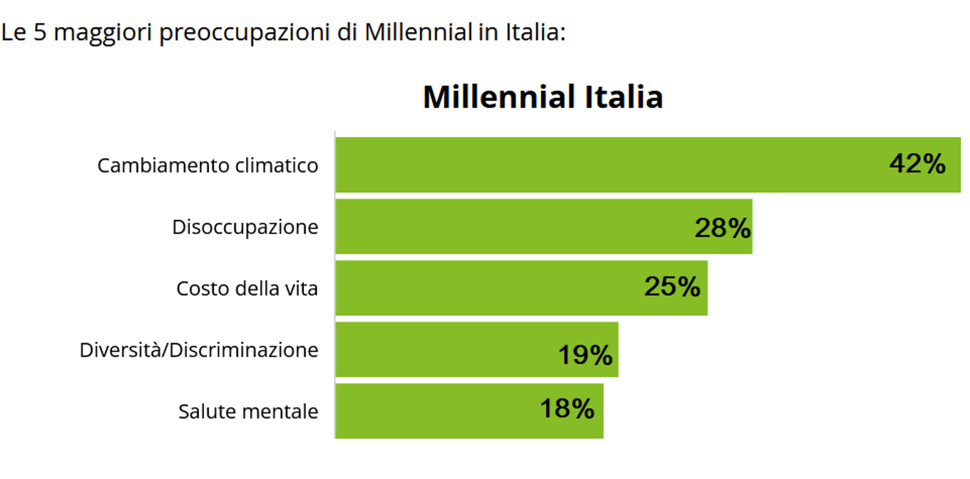 Giovani, lavoro e valori: due generazioni che confermano ancora una volta la loro sensibilità al tema del cambiamento climatico: le cinque grandi sfide del presente, per il 42% della GenZ italiana e il 37% dei Millennial partono dalla lotta al cambiamento climatico, la sfida numero uno da affrontare. Tanto che, dalla ricerca emerge che l’80% della GenZ e il 76% dei Millennial pensa che siamo vicini al “punto di non ritorno” nella risposta al cambiamento climatico.