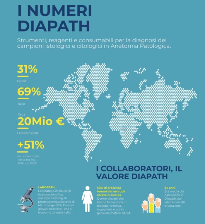 Media impresa di Martinengo, un forte attaccamento al territorio bergamasco, 20 milioni di fatturato, Diapath, fondata da un imprenditore visionario come Vladimiro Bergamini, in vent’anni di crescita ha raggiunto un’alta specializzazione nello sviluppo, progettazione e commercializzazione di strumenti per la diagnosi istologica e citologica dei campioni di anatomia patologica nel settore oncologico. Un ambito in cui la sfida si gioca sulla velocità nel passare dalla diagnosi alla terapia, oggi sempre più personalizzata. Il principio a cui si ispira nella realizzazione della gamma di strumenti è il miglioramento continuo del trattamento del campione istologico, nell’ottica di una target therapy ancora più evoluta e verso una diagnostica oncologica avanzata.