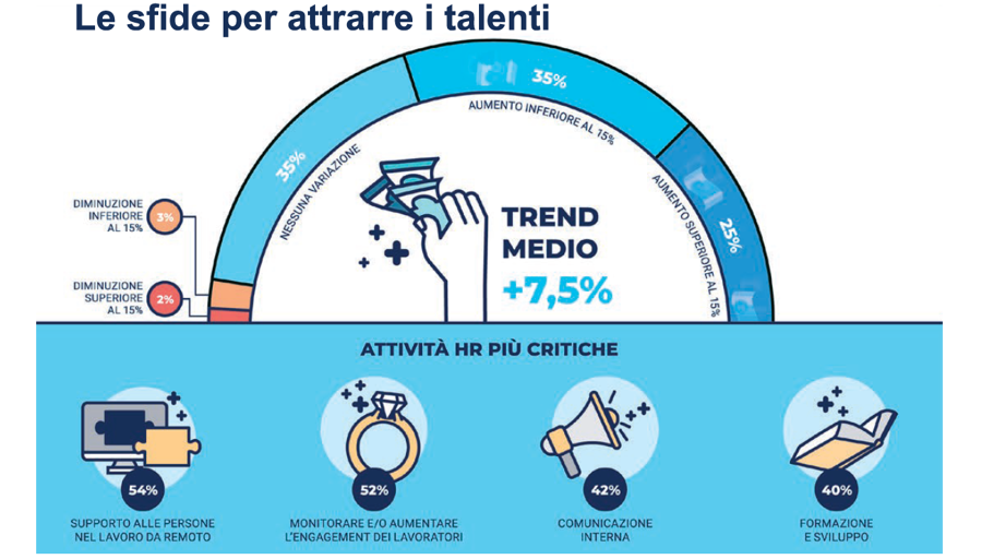 Per questo attrarre talenti, trattenerli, coltivarli nel modo giusto rientra tutto in quello che ora si definiscono le nuove sfide per le imprese e, in particolare, per i responsabili delle risorse umane e HR aziendali. Le imprese mettono sul piatto della propria offerta un diverso approccio e strategie di recruitment. Il 45% delle aziende, pur di intercettare i migliori talenti e in particolare di trattenere i propri migliori uomini, è disposto ad aumentare le forme e le occasioni di smart working, concedere più occasioni per lavorare da casa, organizzare gli spazi di lavoro in modo da garantire maggiore sicurezza, garantire un’offerta di ogni tipo di supporto dal tecnologico allo psicologico, migliorare il pacchetto dei propri benefit.