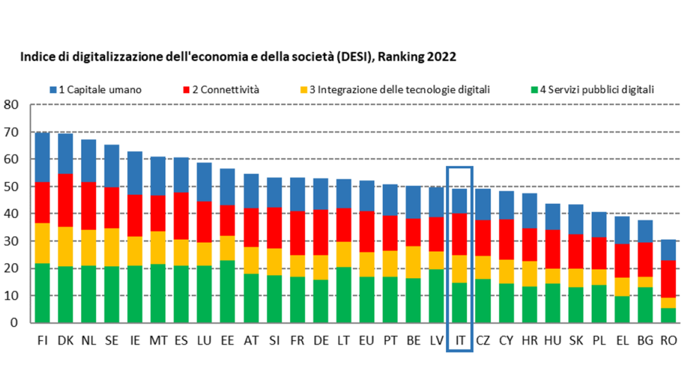 Il monito arriva dal nuovo indice Desi 2022: miglioramenti dell’Italia sulla digitalizzazione di imprese, economia e società: siamo al 18esimo posto. Ma per digital skill siamo quart’ultimi in Europa, un freno alla corsa verso gli obiettivi di crescita. Il 60% delle imprese ha raggiunto il livello base di intensità digitale.