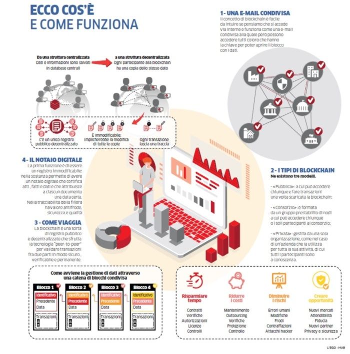 Capire perché il sistema blockchain funziona anche per le imprese (oltre che per la finanza) significa partire dalla fine, dai suoi vantaggi. Il primo: la «catena a blocchi» sancisce la disintermediazione, non c’è più bisogno di una terza parte per garantire la correttezza dei passaggi, delle transazioni, delle relazioni. Il trasferimento è digitale e diretto, da impresa a impresa, a cominciare da quei beni che per un’azienda costituiscono il proprio asset e che aiutano a creare valore.