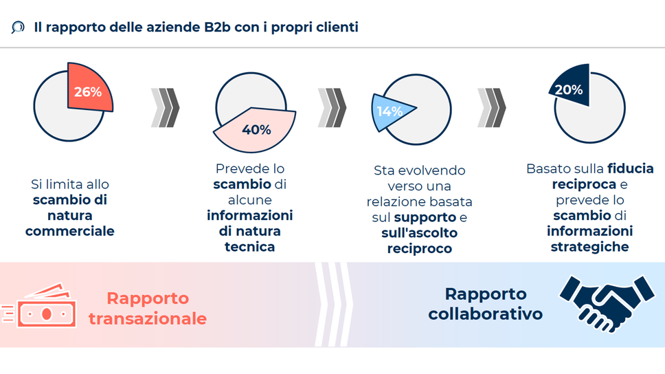 E le prospettive, guardando avanti, sembrano non tradire le opportunità che si fanno avanti, in particolare nelle relazioni dirette fra imprese. Tra le tendenze, sempre a livello B2B, il report dell’Osservatorio Digital B2B, sottolinea la forte attenzione delle imprese nel cercare di migliorare la relazione con il cliente business, soprattutto assegnando un sempre più alto interesse verso la valorizzazione dei dati aziendali. Questa quanto meno è l’intenzione, perché anche qui il ritardo è resta alto.