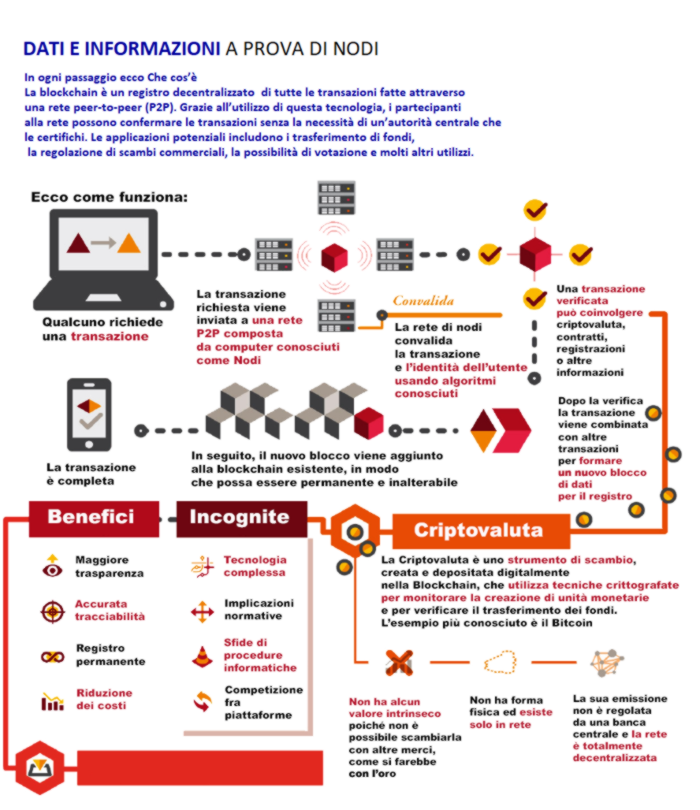 Ma è alle nuove filiere d’impresa che si guarda oggi alle prese con una radicale ristrutturazione in ottica tecnologica, per la loro capacità di introdurre tracciabilità di processi e prodotti, di certificazione di documenti e informazioni, disintermediando ogni transazione, ma aumentando garanzia.La blockchain è questo: letteralmente “catena di blocchi”, sfrutta le caratteristiche di una rete informatica di nodi e consente di gestire e aggiornare, in modo sicuro, un insieme (registro) digitale di dati e informazioni, per esempio le transazioni, in maniera trasparente, condivisa e senza avere un soggetto in mezzo che controlli e verifichi.