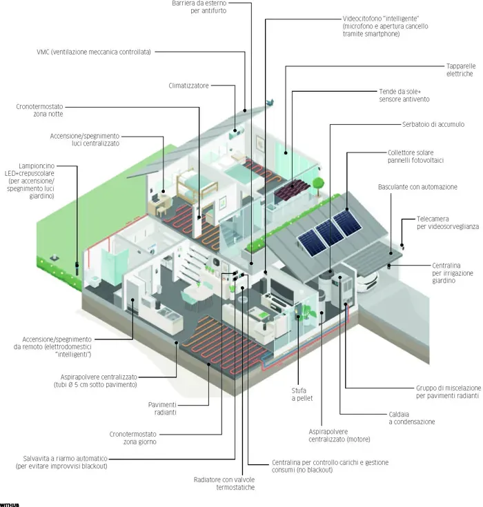 Il disegno qui sotto può dare un’idea delle tecnologie che oggi compongono la casa sostenibile, ma si tratta di uno schema molto semplificato.