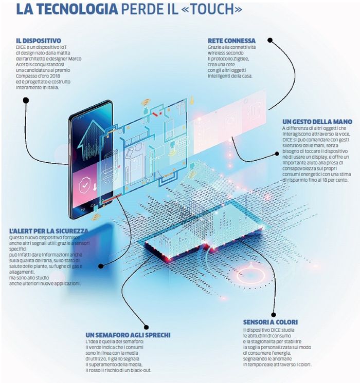 «Il colore è un linguaggio universale, intuitivo e capace di essere letto dall’utente anche senza interrogare il dispositivo - spiegano Acerbis e Bertacchi -. Noi però volevamo un oggetto che fosse non solo funzionale, ma anche bello da vedere. In più, cercavamo una tecnologia che fosse semplice da installare e che funzionasse a batterie, in modo da avere una autonomia di almeno un anno». Acerbis e Bertacchi hanno quindi deciso di creare una startup dedicata allo sviluppo di sistemi IoT di design per l’ambiente domestico che a inizio gennaio ha presentato al Consumer Electronic Show (Ces) di Las Vegas un dispositivo smart che interagisce con l’utente attraverso segnali luminosi e gesti delle mani e integra diversi protocolli wireless. Si chiama DiCE (un po’ perché inizialmente era stato pensato a forma di dado, un po’ perché è in grado di dire, di comunicare), è stato disegnato dalla matita dell’architetto Marco Acerbis ed è made in Italy al cento per cento.