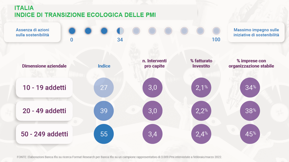Ci sono alcuni dati che il neonato Osservatorio della Banca Ifis, il Kaleidos Impact Watch il cui lavoro è servito per mettere a punto un indice per la sostenibilità capace di tracciare il quadro sulla qualità delle iniziative messe in atto dalle imprese nel cammino della transizione ecologica (il testo integrale del report è allegato a questo articolo) : i dati mettono in evidenza come in particolare non oltre il 38% delle piccole e medie imprese non ha ancora investito in misure o in interventi di sostenibilità, poco oltre il 50% delle imprese ha già istituito una divisone dedicata alle strategie Esg; ma solo il 17% ha già pubblicato un bilancio di sostenibilità e un altro 11% prevede di farlo entro il 2024. La trasformazione ecologica è un passaggio impegnativo, richiede progettualità, visione ma anche competenze, tecnologia e risorse finanziarie.