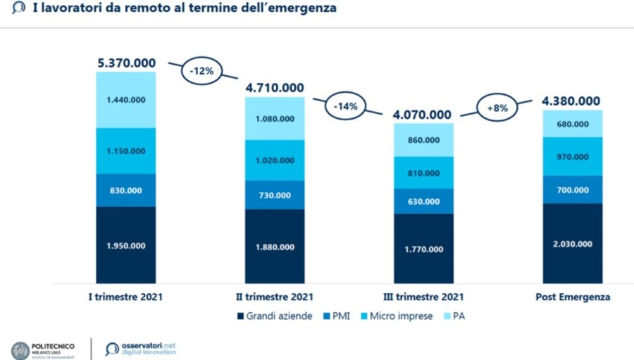 I vantaggi: l’equilibrio fra lavoro e vita privata è migliorato per la maggior parte di grandi imprese (89%), Pmi (55%). Ma la combinazione di lavoro forzato da remoto e pandemia ha avuto anche conseguenze negative sugli smart worker: sono calati dal 12% al 7% i lavoratori pienamente “ingaggiati”, il 28% ha sofferto di tecnostress, il 17% di overworking.