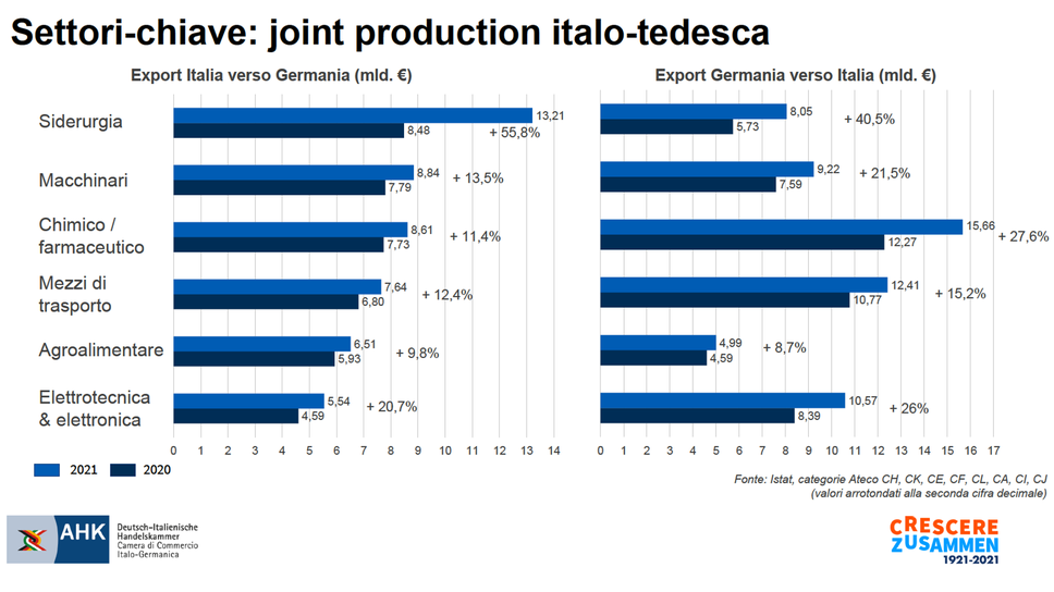 Un affondo nei numeri dell’interscambio, per quel che riguarda l’export dell’Italia i settori principali sono la siderurgia 13,21 miliardi (+55,8% rispetto al 2020), i macchinari 8,84 miliardi, la chimico-farmaceutica 8,61 miliardi, seguiti da automotive 7,64 miliardi e alimentare 6,51 miliardi. Per l’export dalla Germania, invece, al primo posto c’è la chimico-farmaceutica con 15,66 miliardi, seguita dall’automotive con 12,41 miliardi, l’elettrotecnica ed elettronica con 10,57 miliardi, i macchinari con 9,22 miliardi e la siderurgia con 8,05 miliardi (cresciuta maggiormente rispetto al 2020 con un +40,5%).