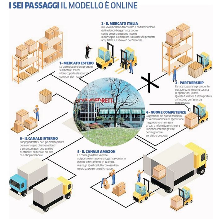 Il modello Foppapedretti prevede la gestione diretta delle spedizioni sul mercato Italia. Mentre ricorre a distributori locali per Grecia, Cina e Corea, e in partnership con Amazon per Spagna, Germania e Inghilterra. - Le strategie commerciali del futuro