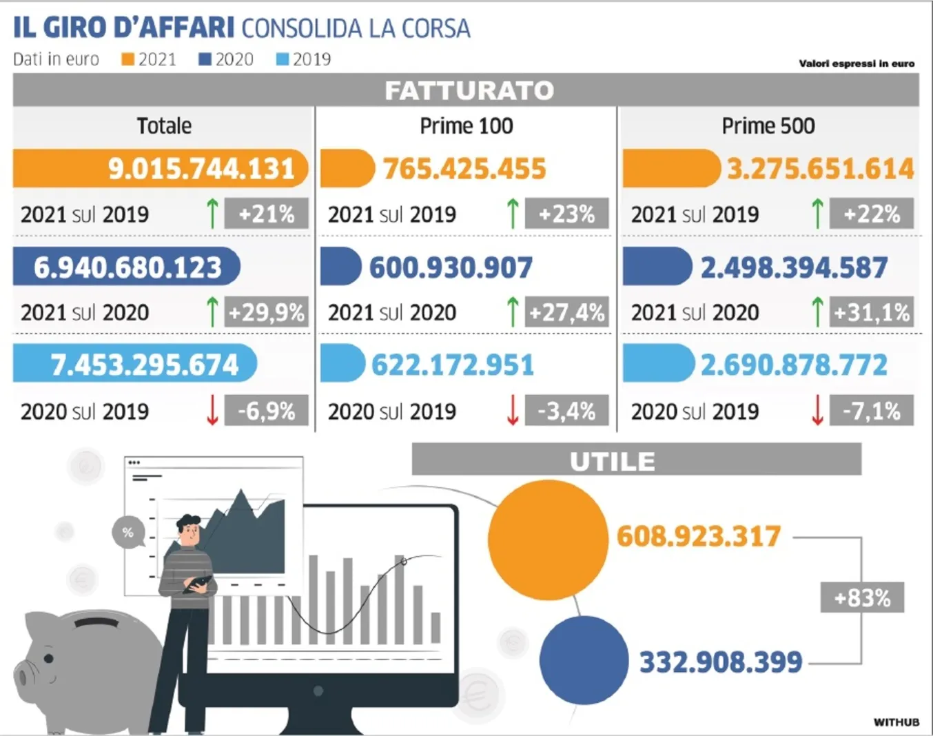 Le classifiche pubblicate nella nuova edizione del volume di Skille+2000, confermano questi risultati. Il primo importante traguardo è segnato dal balzo in avanti sia dei profitti, con un utile complessivo che non solo quasi doppia il risultato del 2020 (+83% a 609 milioni), ma cresce di un +45% anche rispetto al netto del 2019. Una crescita da primato anche per il giro d’affari 2021 (chiaramente amplificata dalla comparazione sui valori minimi del 2020), ma che rappresenta ugualmente una significativa espansione dei ricavi aggregati 2021: un aumento del 30% fino sopra i 9 miliardi sul 2020, e di un ulteriore +21% sulla quota ricavi 2019.