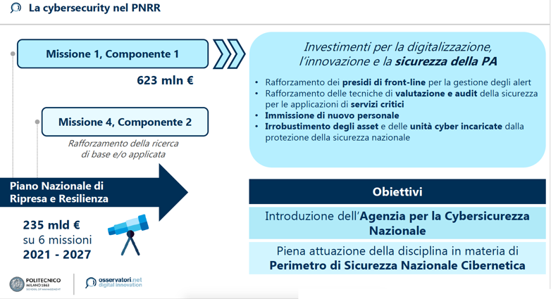 Se l’interesse delle imprese alla cybersecurity è ai massimi storici, cresce anche l’attenzione delle istituzioni. L’introduzione di misure in questo ambito, per esempio, nel solco del Pnrr, prevedono nella Missione 1 investimenti per 623 milioni di euro in presidi e competenze di cybersecurity nella pubblica amministrazione. E nella Missione 4 ulteriori fondi per la ricerca e la creazione di partenariati su temi innovativi, tra cui la sicurezza informatica.