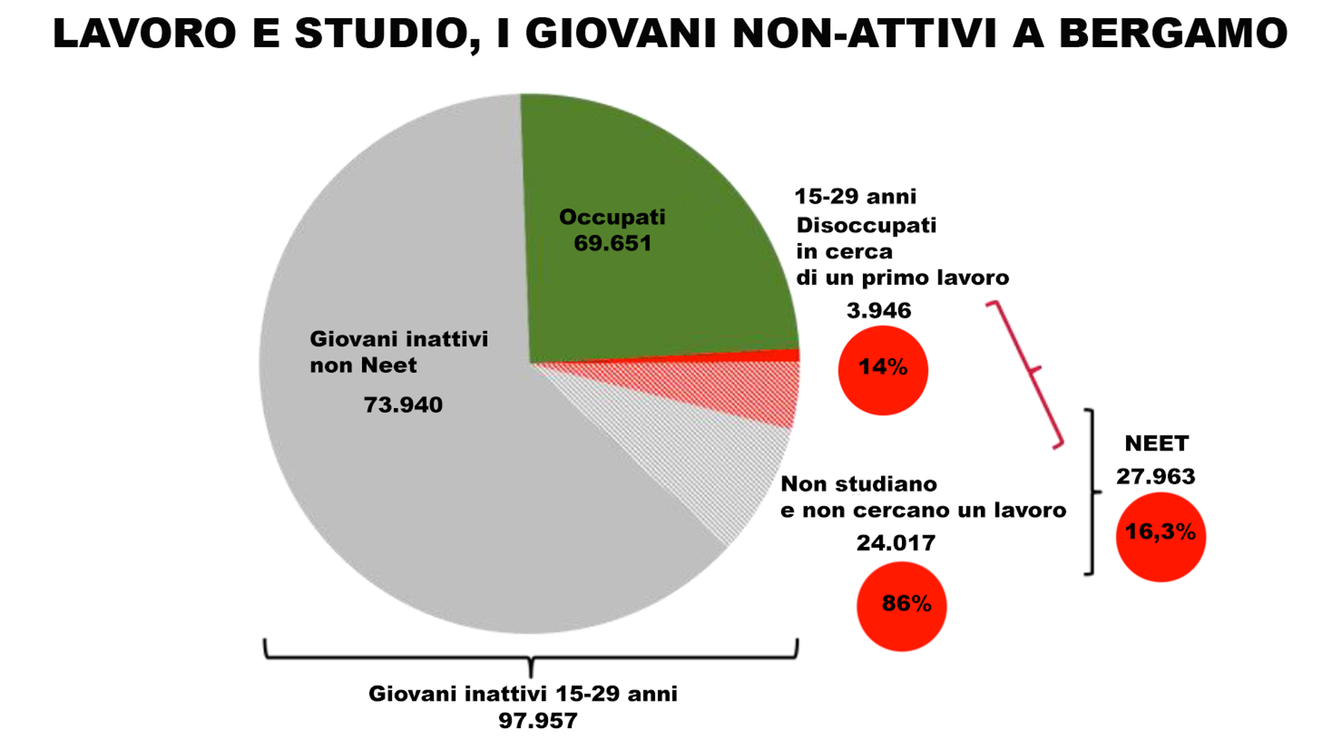 Bergamo non brilla, anzi fa anche peggio: nel 2021 (ultimi dati disponibili) i giovani Neet bergamaschi sono ancora 27.900 al 16,3%: 3.900 non si formano più, ma restano alla ricerca di un lavoro; altri 24mila non cercano più nemmeno il posto. Il dato è sceso (dal 18,3% del 2020 e da quarta a decima provincia lombarda), ed è spiegato da una disoccupazione giovanile riassorbita nel post-Covid, anche se in parallelo continua a crescere la difficoltà di reperimento di nuove competenze.