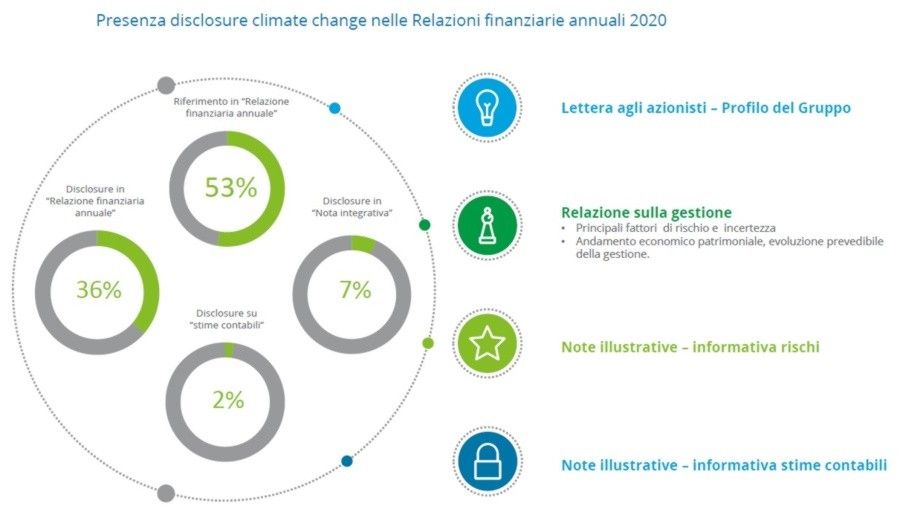 «In linea con il trend già emerso nel 2019, osserviamo una crescente diffusione dell’informativa fornita nelle Relazioni finanziarie annuali 2020 delle società quotate e una maggiore consapevolezza del fatto che le tematiche legate al cambiamento climatico non possono essere confinate al solo contesto della Dichiarazione non finanziaria -, spiega ancora Stefano Dell’Orto -. Si tratta, però, di un primo stadio del percorso evolutivo atteso dall’ecosistema del reporting finanziario, dato che solo in alcuni casi tale informativa viene estesa ai riflessi del cambiamento climatico nella valutazione delle poste iscritte in bilancio. E anche in tali casi l’informativa fornita risulta prevalentemente di carattere qualitativo».