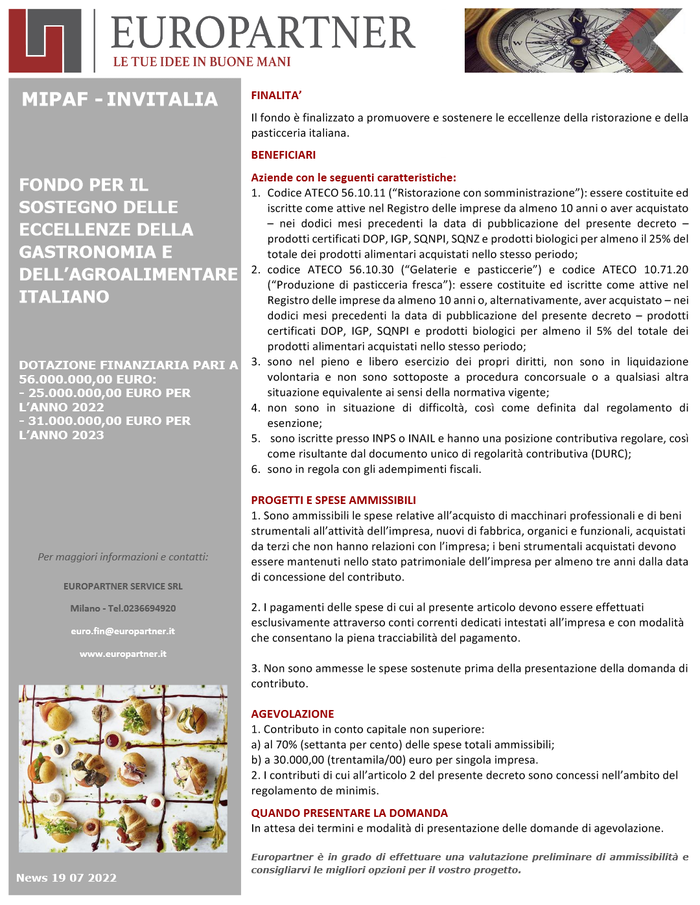 Promuovere e sostenere le eccellenze della ristorazione e della pasticceria italiana. È lì’obiettivo del fondo istituito dal Ministero delle politiche agricole alimentari e forestali e da Invitalia che mette a disposizione 25 milioni di euro per il 2022 e 31 milioni per il 2023.