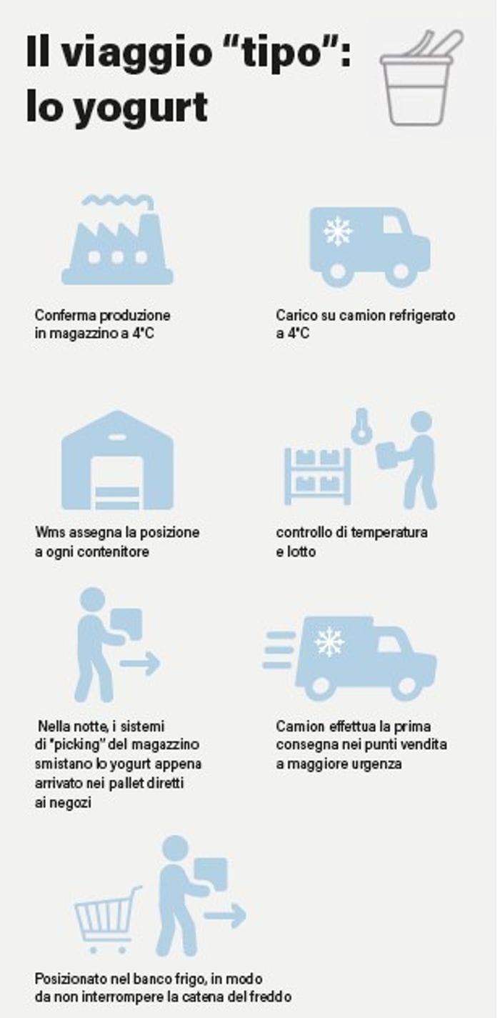 La catena logistica del settore alimentare parte con la previsione di domanda da parte del distributore, sulla base dello storico dei dati e delle promozioni attive. Questa stima genera un ordine al fornitore, che invia i suoi prodotti al Ce.di. Ogni consegna prenota uno slot al centro distributivo per evitare le code tra i camion. All’arrivo vengono eseguiti dei controlli documentali su lotti e scadenze, nonché delle ispezioni qualitative sull’integrità dei pallet e sulla loro temperatura. Si procede quindi all’ingresso a temperatura nelle celle dedicate. Ogni Ce.di. ha un Warehouse management system, o Wms, ovvero un sistema automatico che assegna a ogni prodotto la sua posizione ottimale: quelli ad alta rotazione sono stoccati vicino alle baie, mentre gli altri via via sempre più in profondità nel magazzino. Il Wms governa anche il picking, che avviene secondo la metodologia first expire first out (Fefo), ovvero “esce prima ciò che scade prima”, per la quale i prodotti a scadenza ravvicinata vengono inviati per primi ai negozi, in modo che vengano venduti prima di arrivare a scadenza della shelf life.