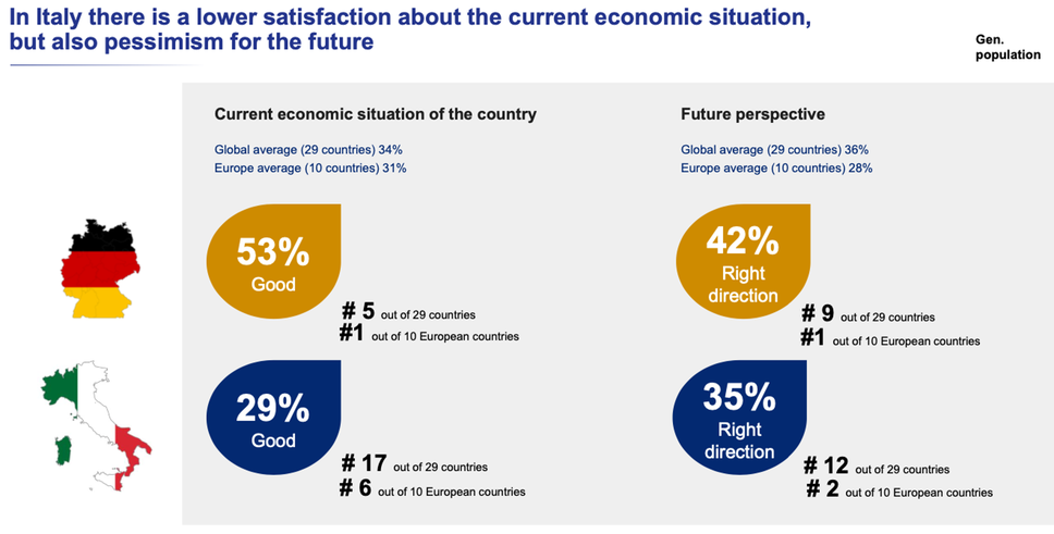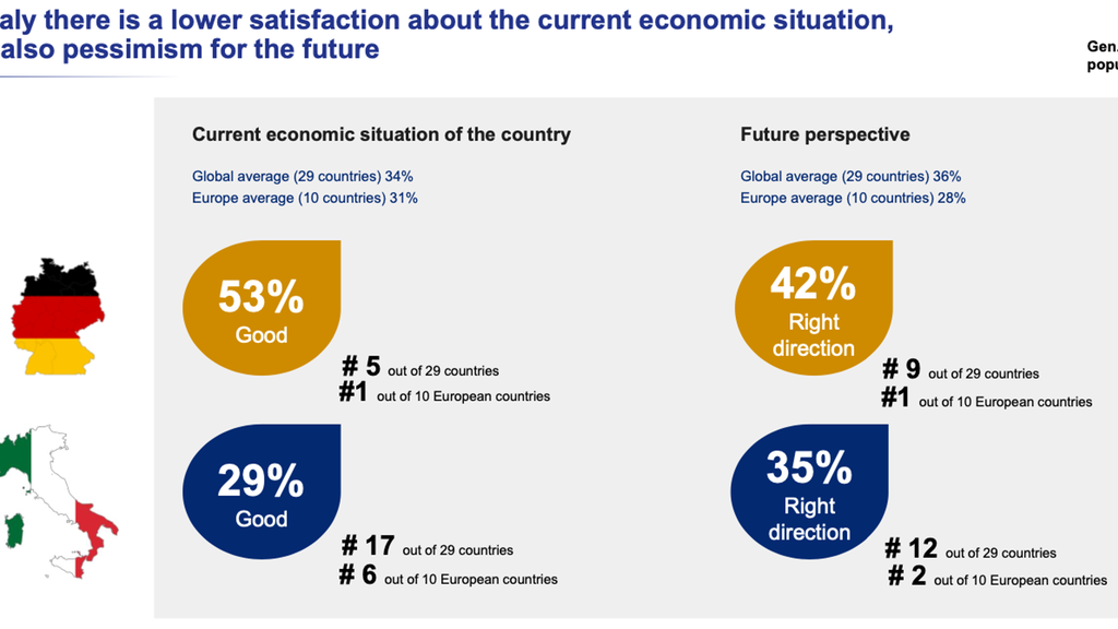 L’indagine Ipsos si è quindi focalizzata sul ruolo, sui protagonismi e sulle attese delle aziende che guardano a questa stretta relazione. Ma passando prima da una survey per testare il livello di percezione delle popolazioni dei due paesi, sia come cittadini, sia come consumatori. Germania e Italia godono entrambe della migliore reputazione in un contesto europeo, Germania al primo posto, Italia al secondo (escludendo dall’Ue Giappone e Canada). Italia davanti anche a Francia e Regno Unito. Ma in Germania c’è un contesto più positivo che in Italia: la percezione della situazione economica è decisamente migliore a Berlino, 50,3% rispetto a Roma (43,8%, sesta posizione in Europa) su un valore medio globale di 46,2%. Valutazione che si ripercuote anche sulla soddisfazione dei consumatori, i tedeschi hanno un livello di fiducia più elevato (53%) e le persone sono più soddisfatte della propria situazione economica rispetto all’Italia (29%). Tuttavia, se si considerano le prospettive future, il divario tra Italia e Germania si riduce, e cresce al 35% in Italia (si pensa di “andare nella direzione giusta”) ma scende al 42% in Germania.